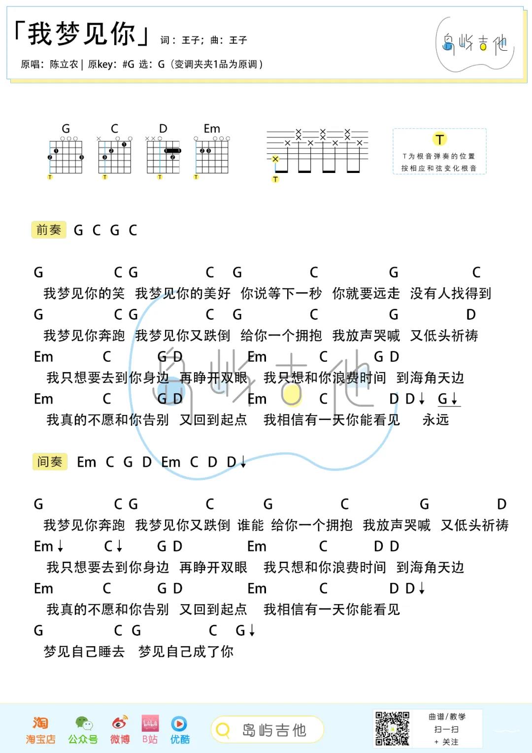 曲谱介绍: 陈立农《我梦见你》吉他弹唱谱,采用G调指法编配,共有1张高清图谱,免翻页排版设计。