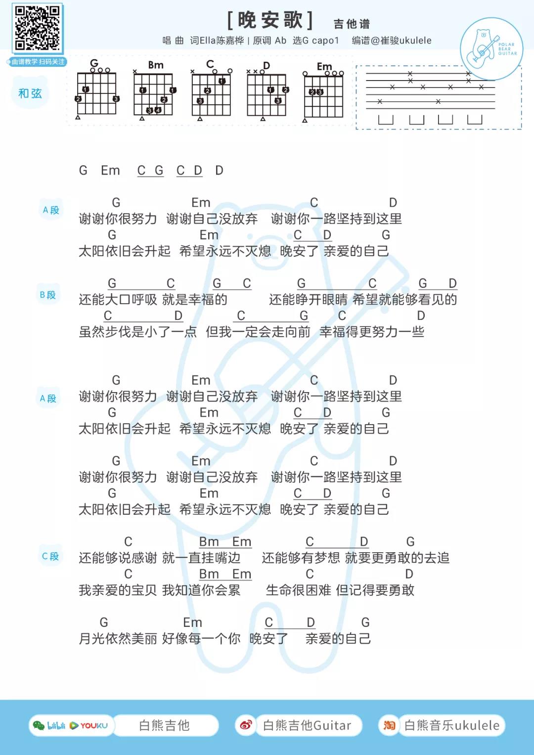 曲谱介绍: 陈嘉桦《晚安歌》吉他弹唱谱,采用G调指法编配,共有1张高清图谱,免翻页排版设计。
