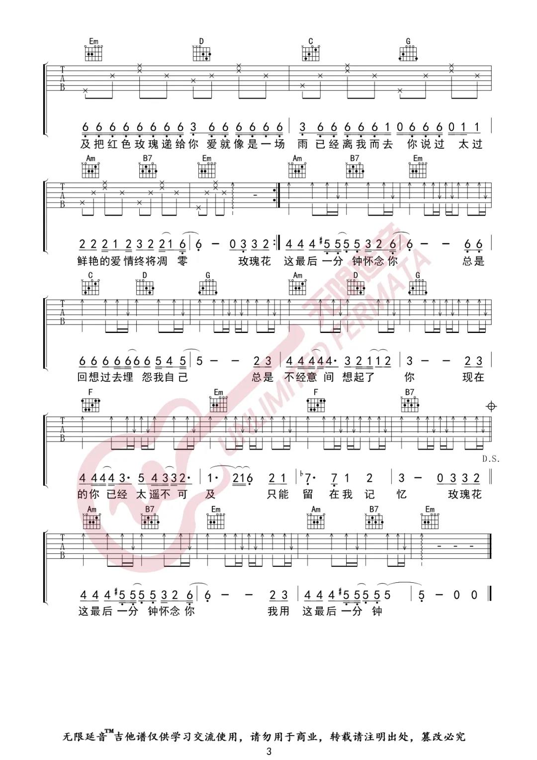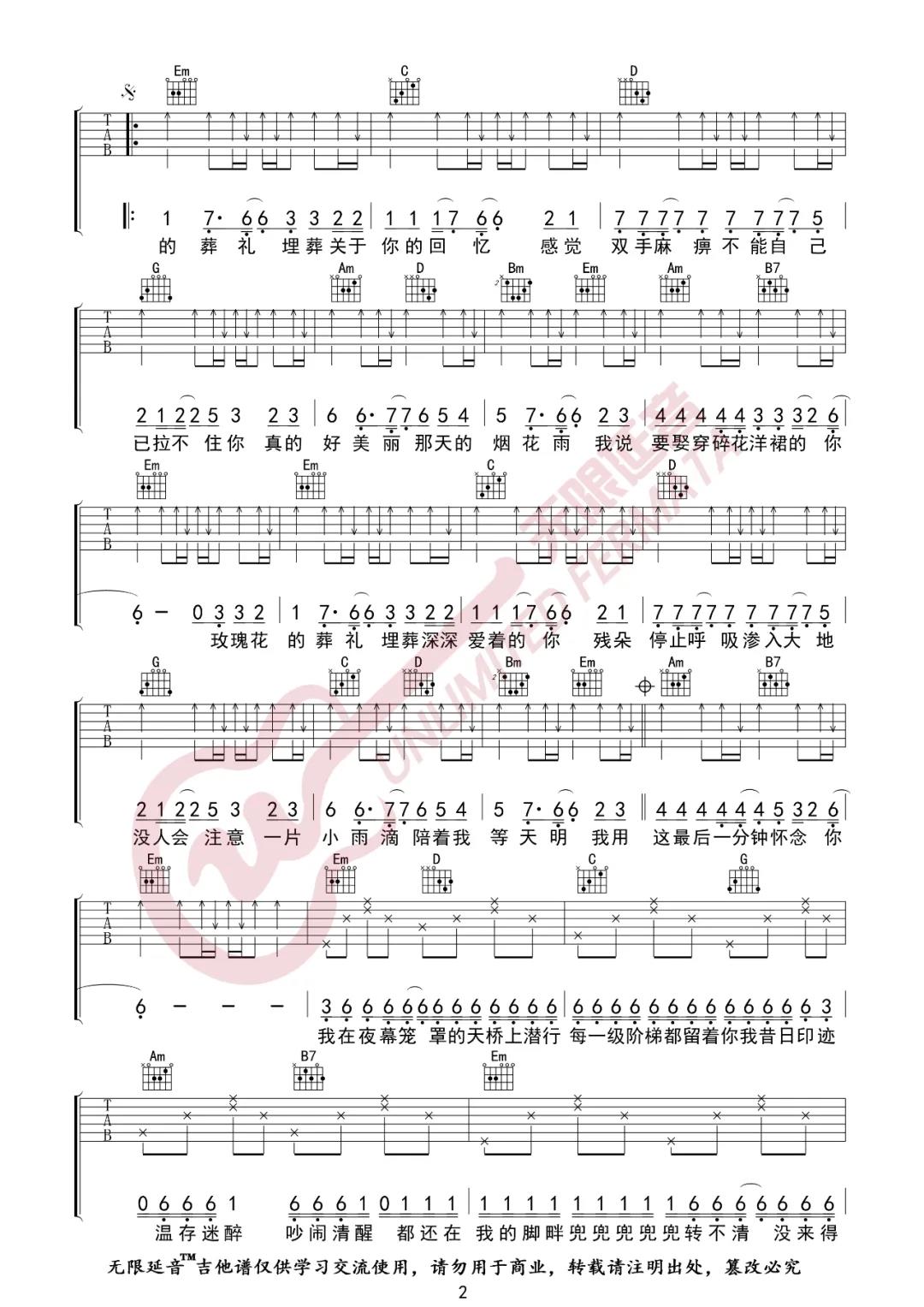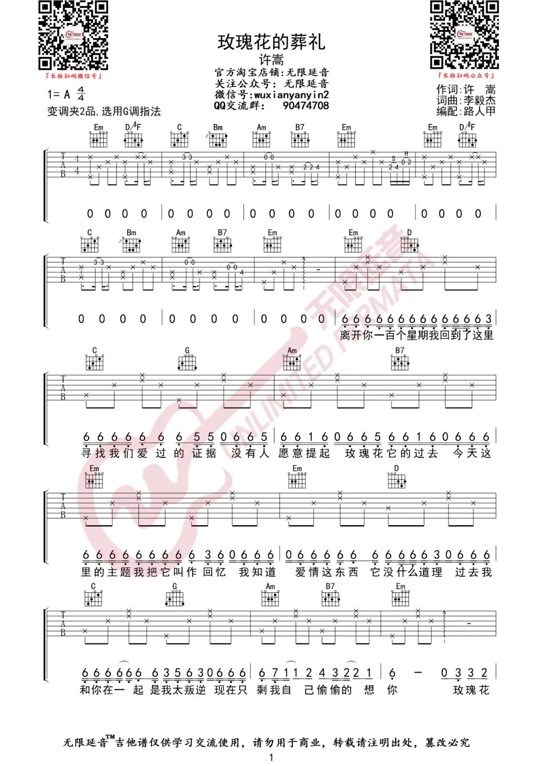 曲谱介绍: 许嵩《玫瑰花的葬礼》吉他弹唱谱,采用G调指法编配,共有3张高清图谱。