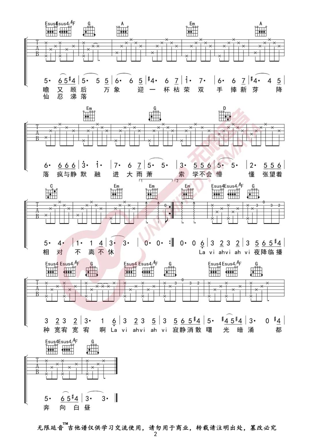 曲谱介绍: 华晨宇《降临》吉他弹唱谱,采用G调指法编配,共有2张高清图谱,免翻页排版设计。