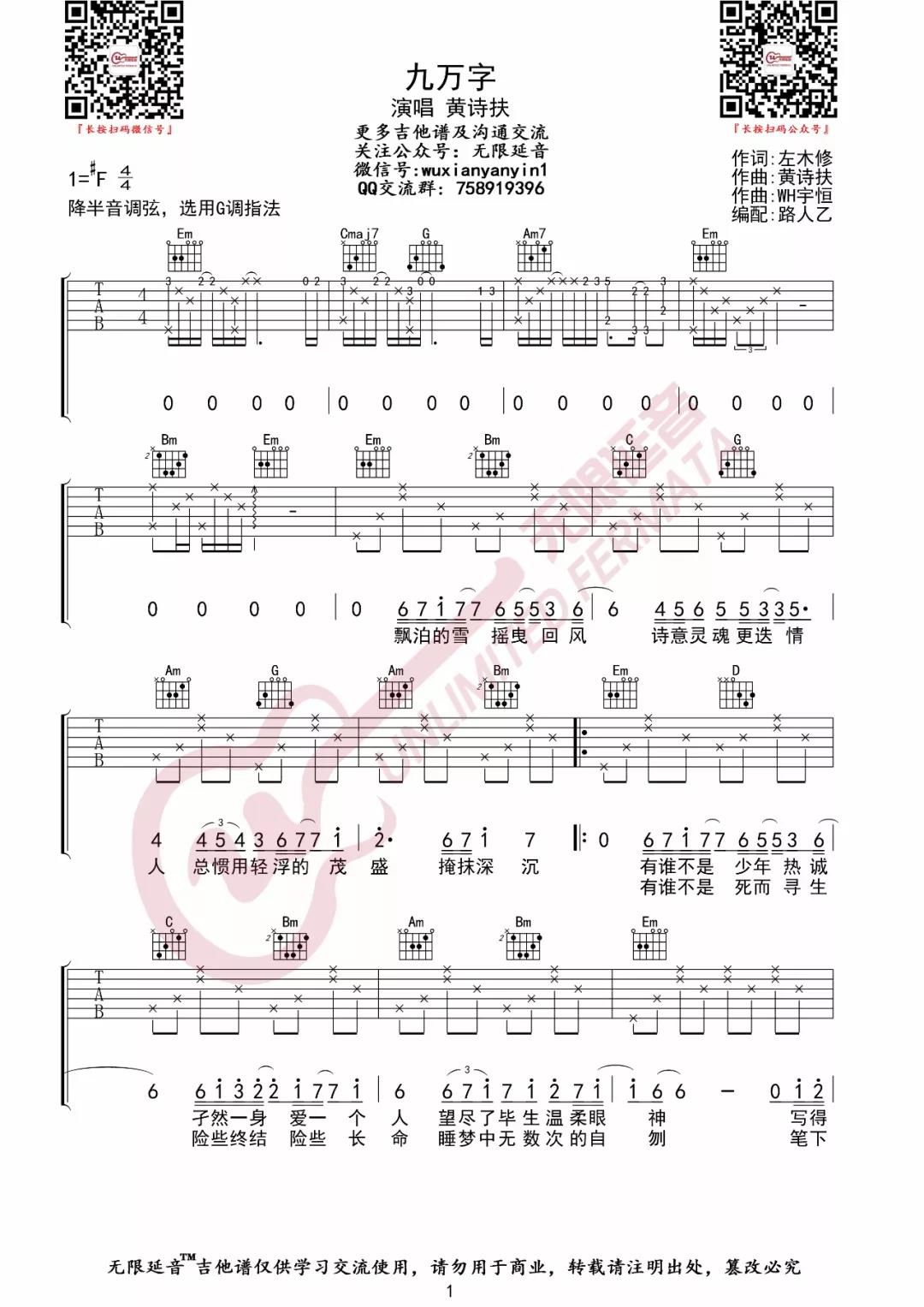 九万字吉他谱 - 黄诗扶 - G调吉他弹唱谱