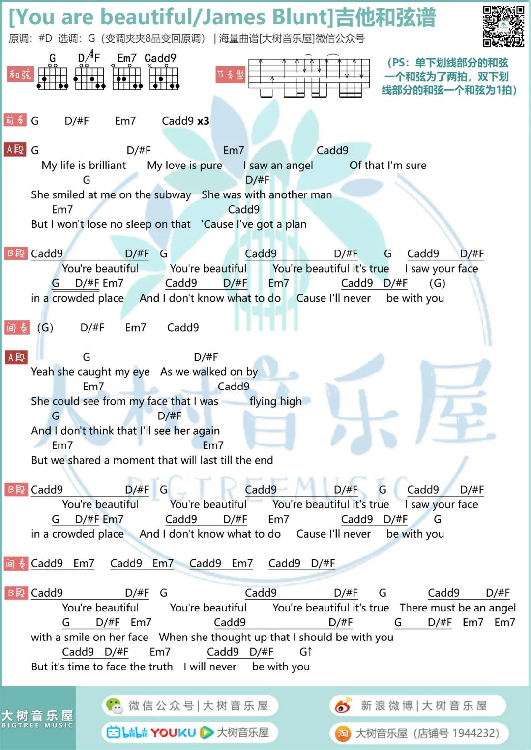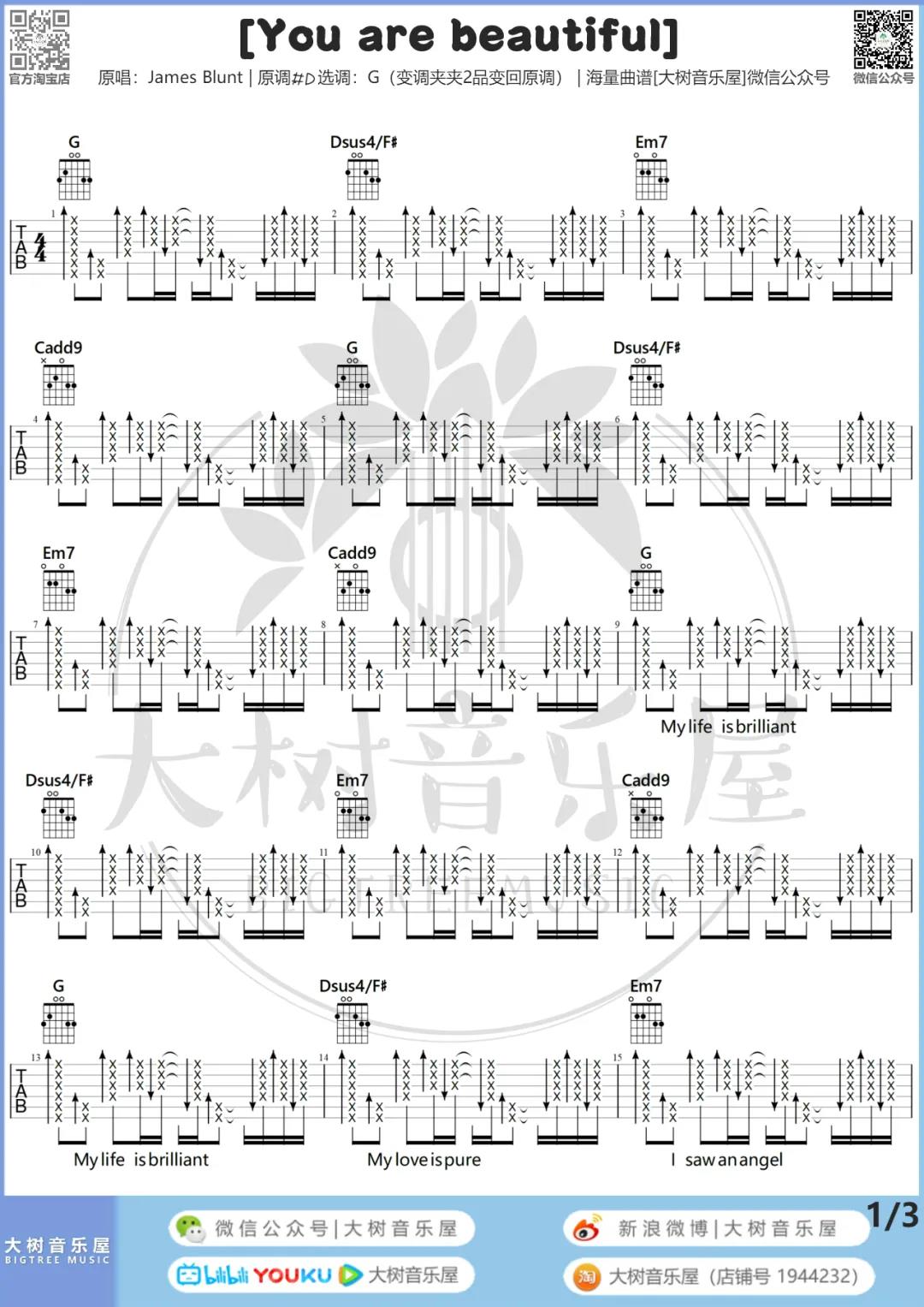 曲谱介绍: James,Blunt《Youarebeautiful》吉他弹唱谱,采用G调指法编配,共有4张高清图谱。