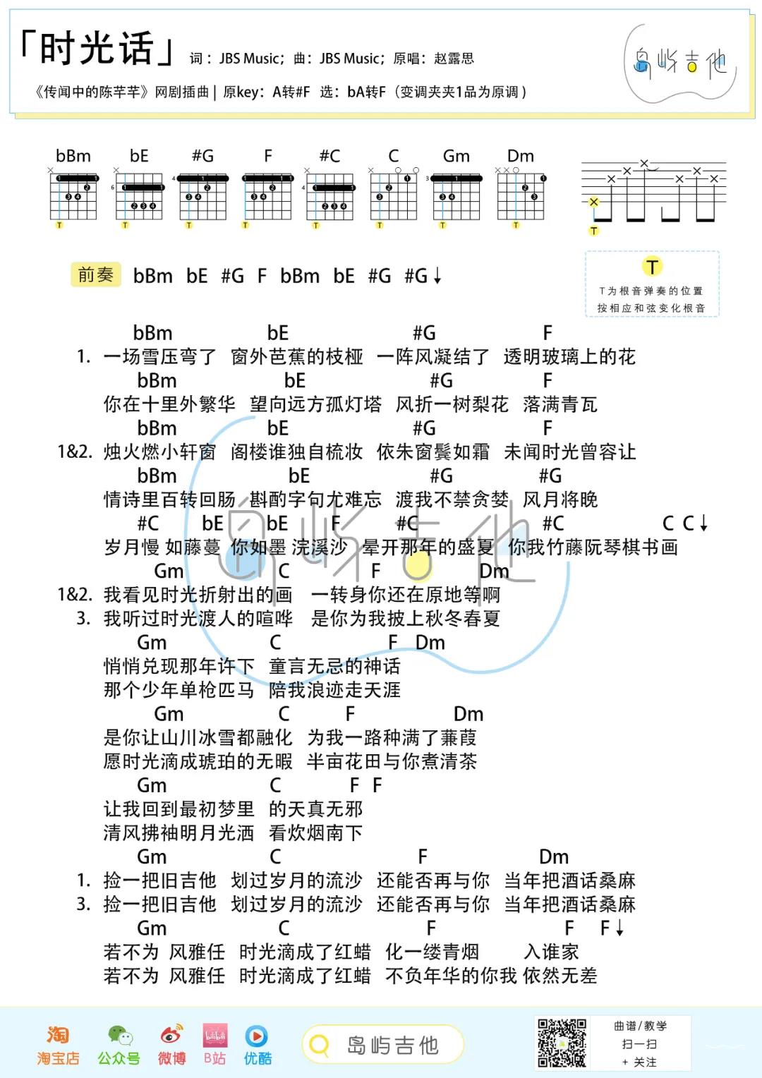 曲谱介绍: 赵露思《时光话》吉他弹唱谱,采用F调指法编配,共有1张高清图谱,免翻页排版设计。