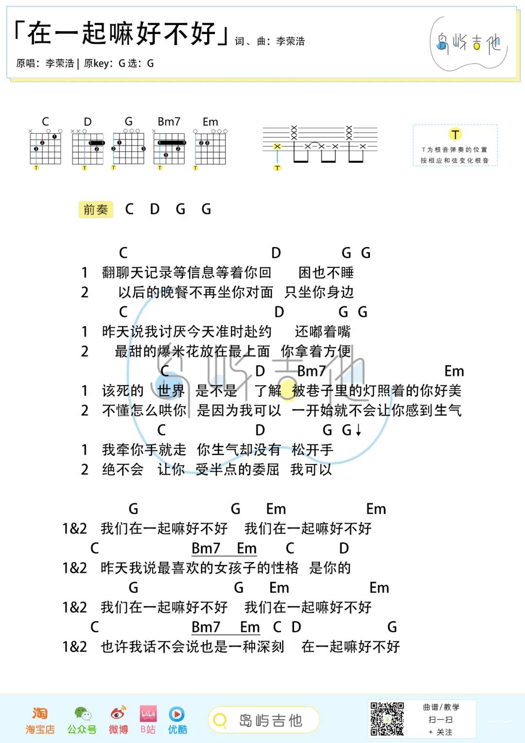 曲谱介绍: 李荣浩《在一起嘛好不好》吉他弹唱谱,采用G调指法编配,共有1张高清图谱,免翻页排版设计。