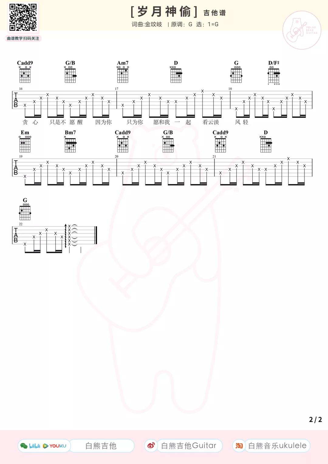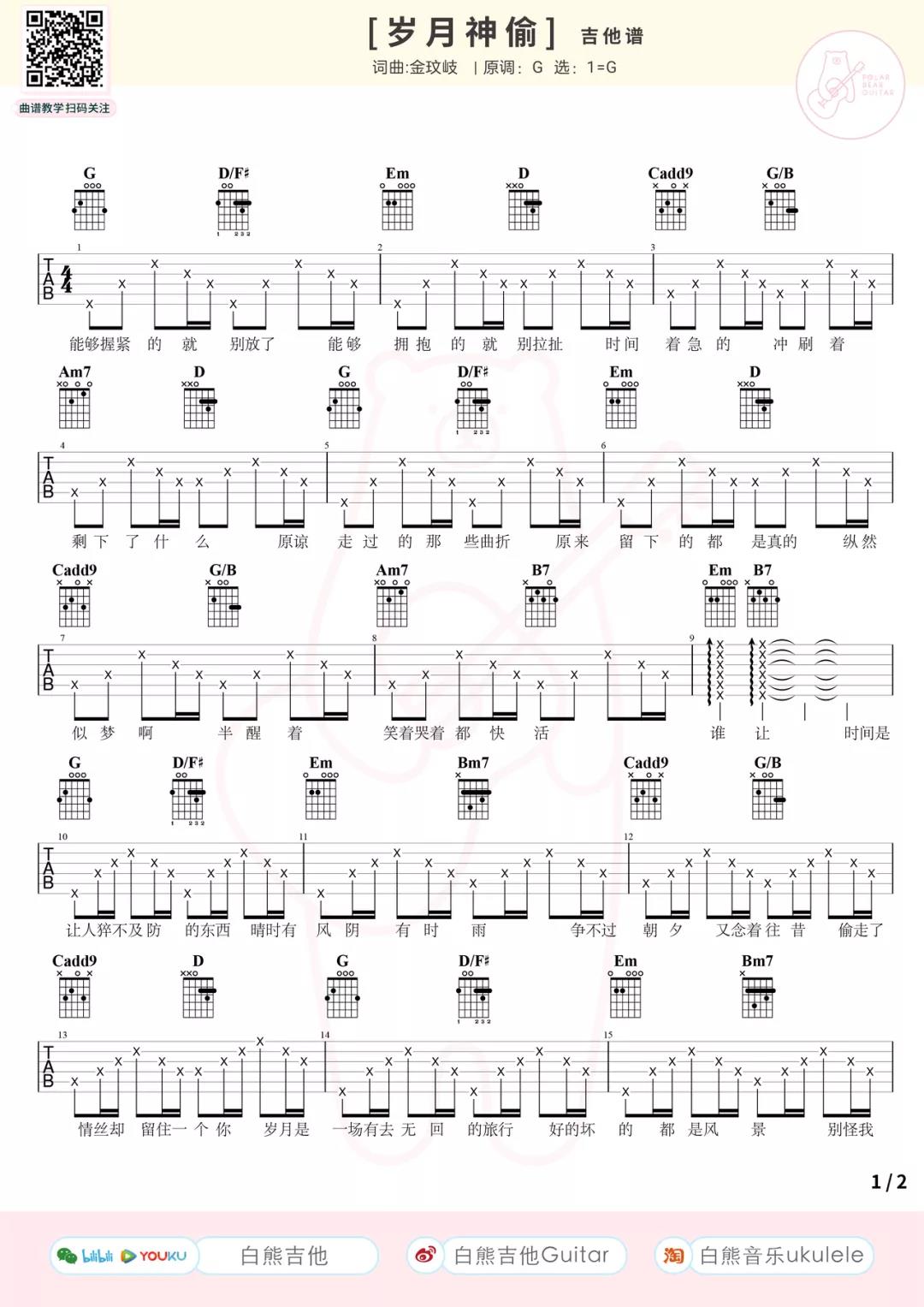 曲谱介绍: 金玟岐《岁月神偷》吉他弹唱谱,采用G调指法编配,共有2张高清图谱,免翻页排版设计。