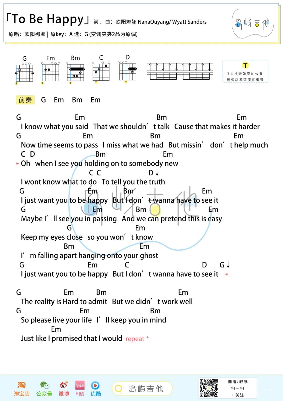 曲谱介绍: 欧阳娜娜《ToBeHappy》吉他弹唱谱,采用G调指法编配,共有1张高清图谱,免翻页排版设计。