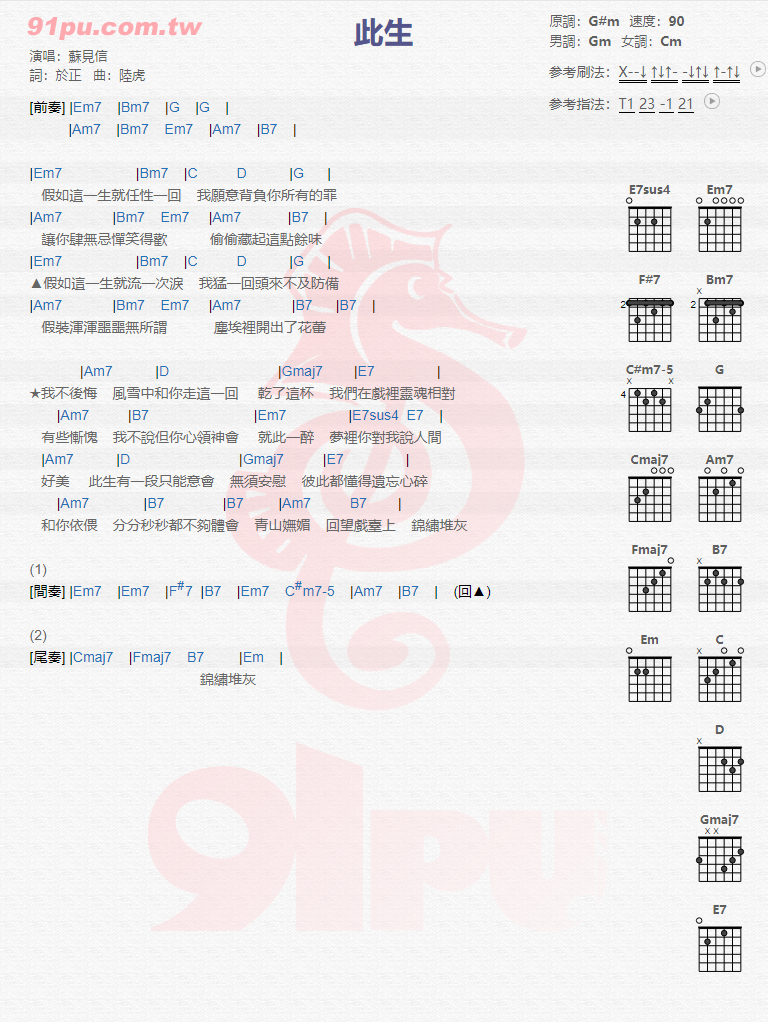 曲谱介绍: 苏见信《此生》吉他弹唱谱,采用G调指法编配,共有1张高清图谱,免翻页排版设计。