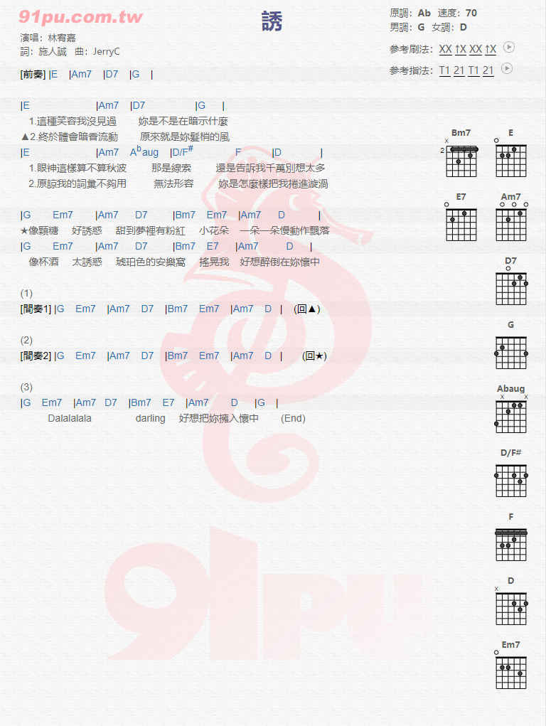 曲谱介绍: 林宥嘉《诱》吉他弹唱谱,采用A调指法编配,共有1张高清图谱,免翻页排版设计。