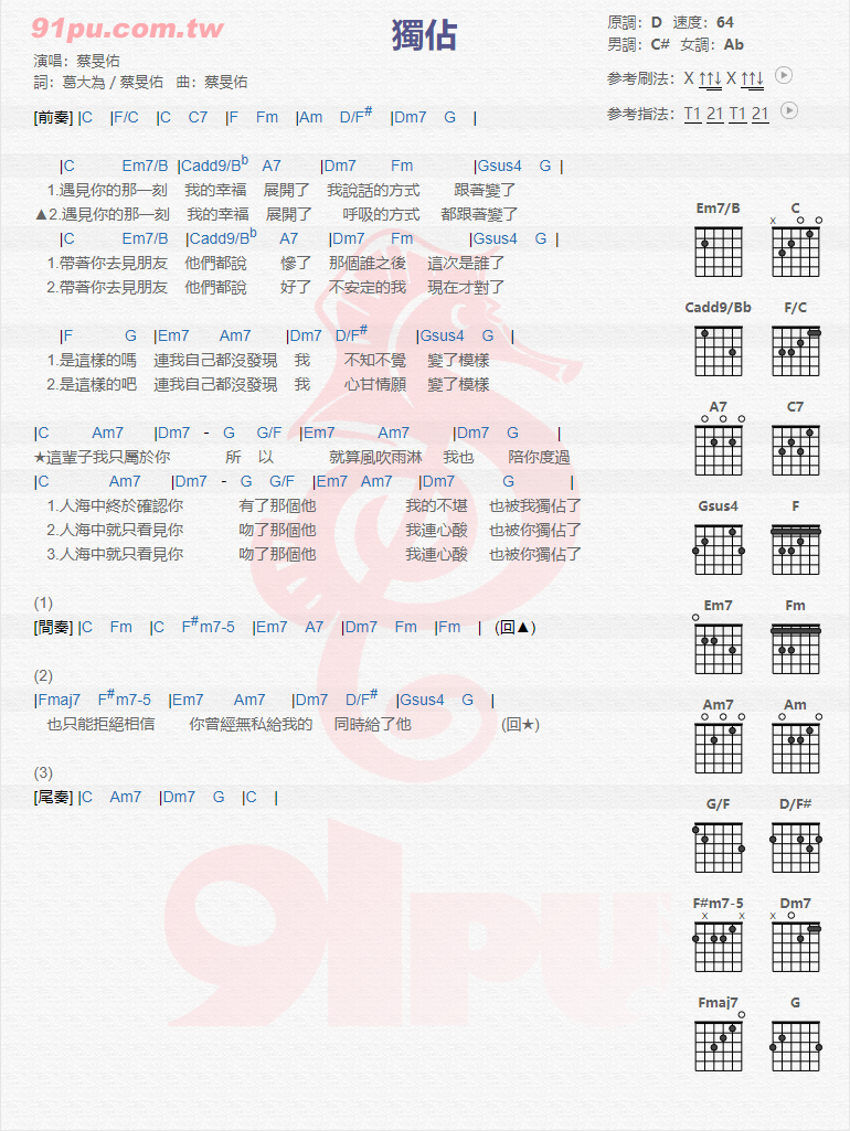 独占吉他谱 - 蔡旻佑 - D调吉他弹唱谱