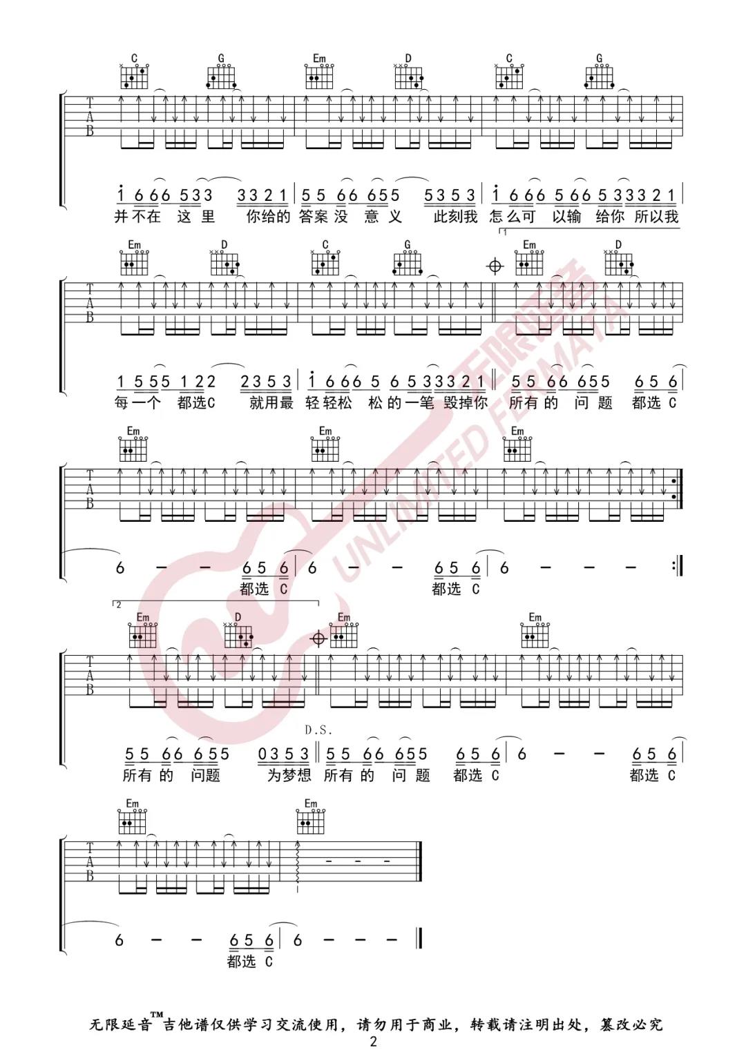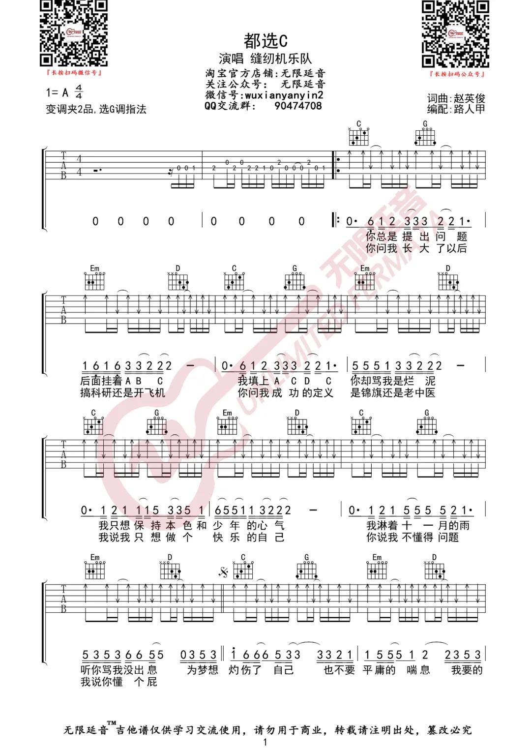 曲谱介绍: 缝纫机乐队《都选C》吉他弹唱谱,采用G调指法编配,共有2张高清图谱,免翻页排版设计。