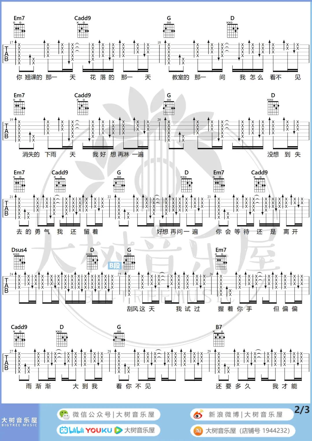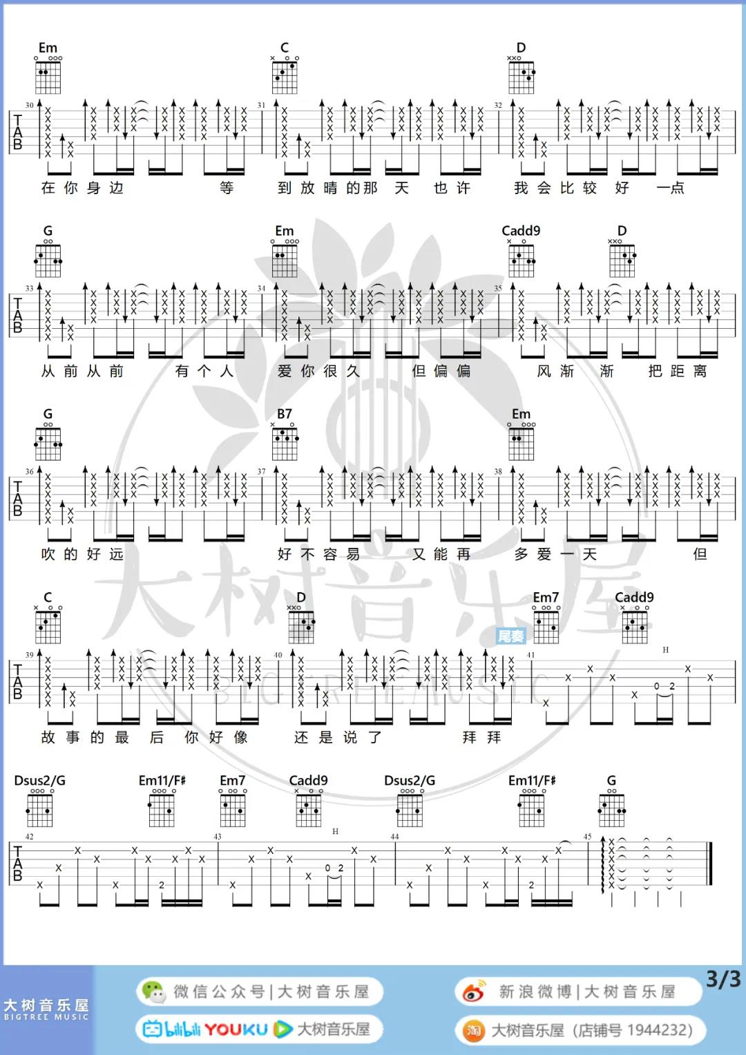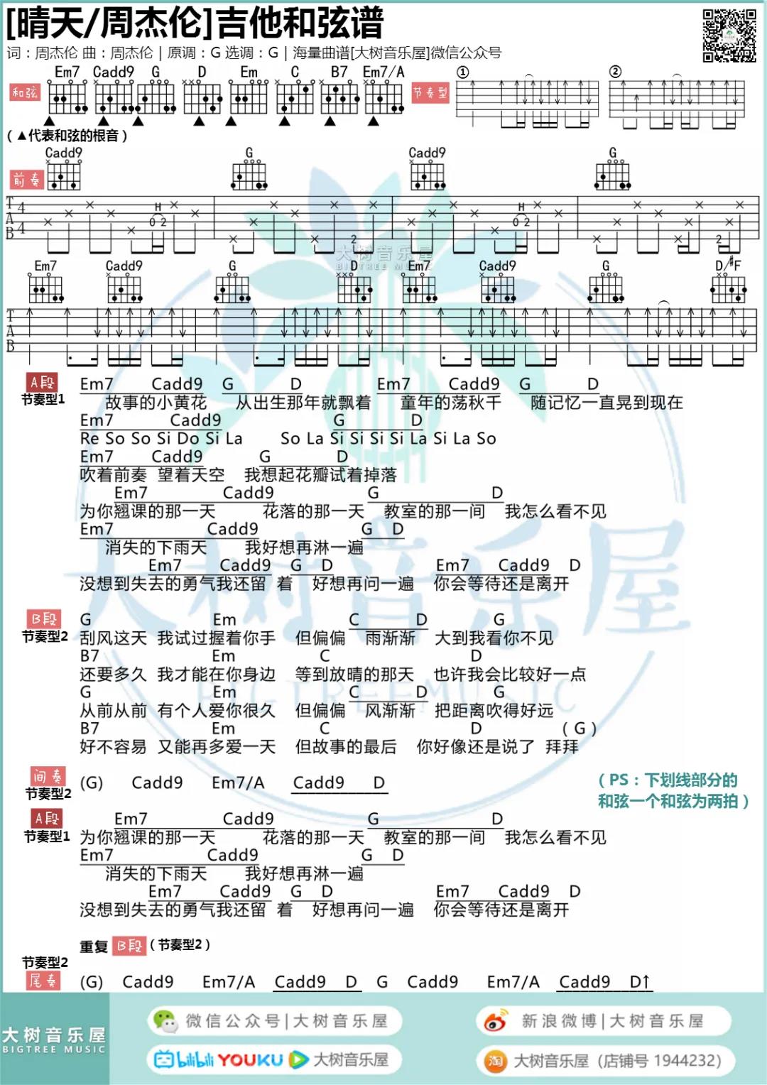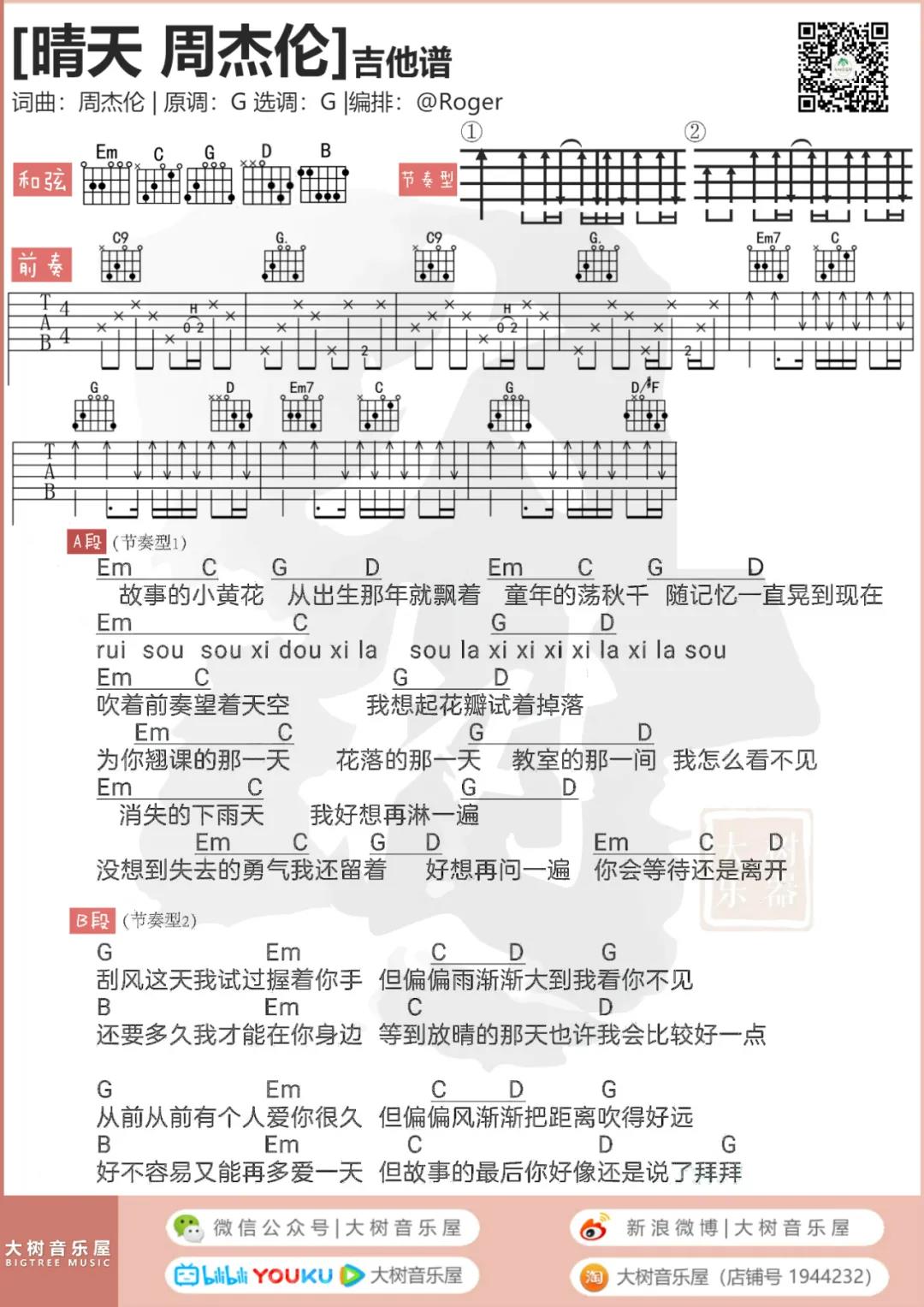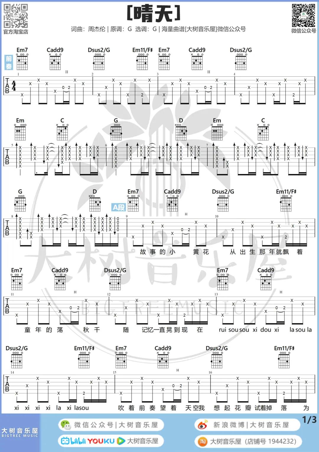 曲谱介绍: 周杰伦《晴天(重置版)》吉他弹唱谱,采用G调指法编配,共有5张高清图谱。