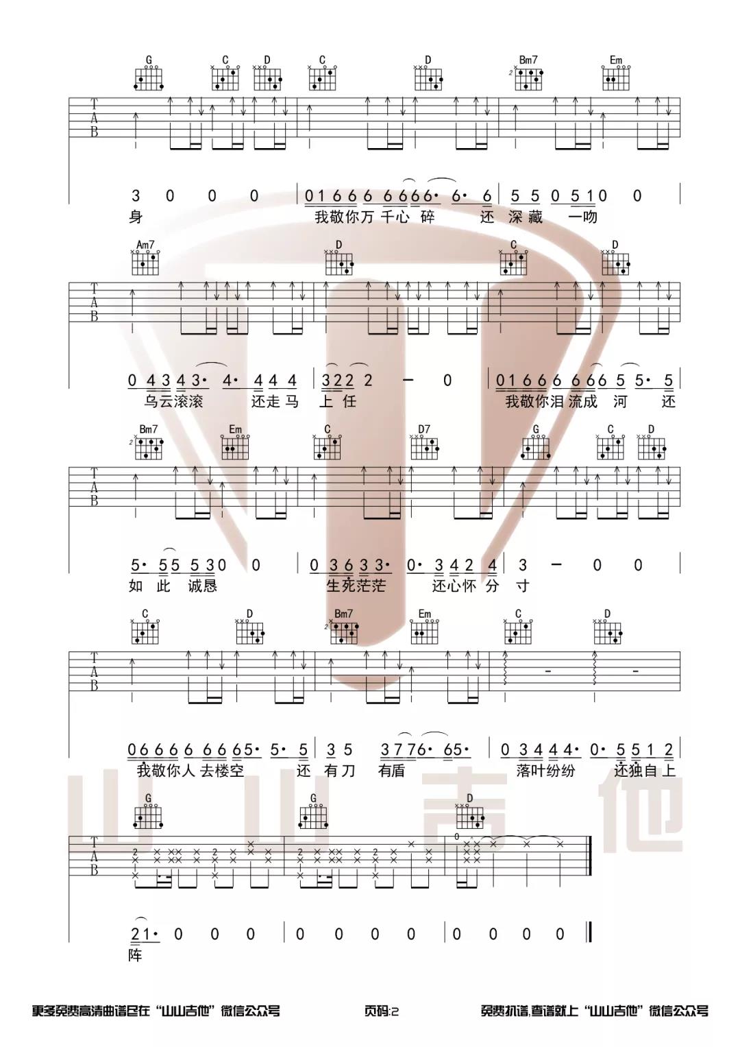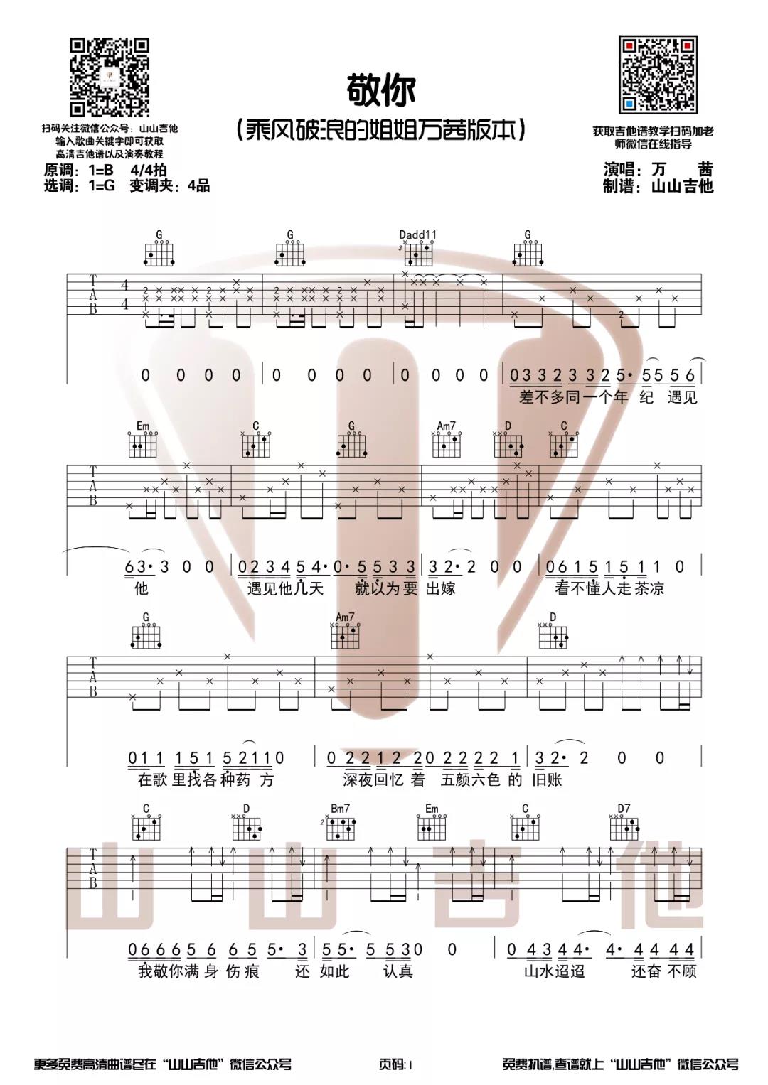 曲谱介绍: 万茜《敬你》吉他弹唱谱,采用G调指法编配,共有2张高清图谱,免翻页排版设计。
