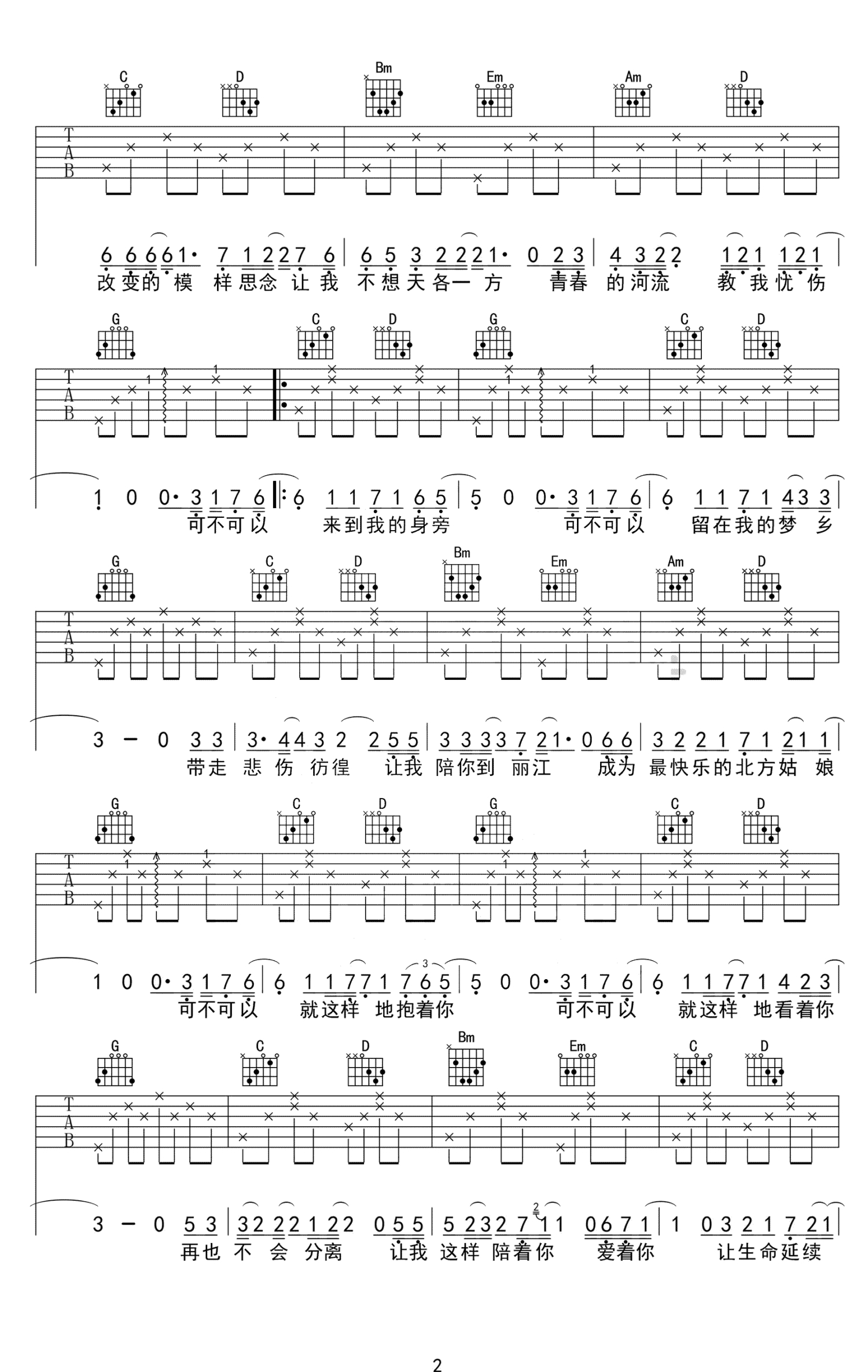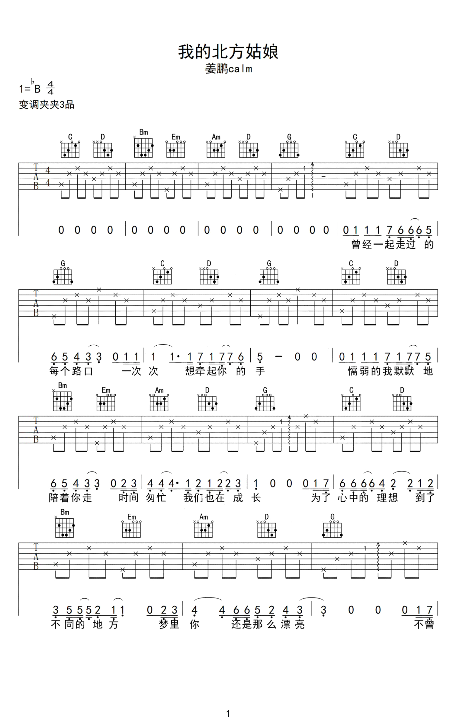 曲谱介绍: 《我的北方姑娘》吉他谱,姜鹏Calm演唱的一首很简单抒情民谣歌曲,我的北方姑娘六线谱,原调是bB调,选用的是G调指法编配,变调夹夹在吉他的3品位置,整首歌以分解为主。编配提示:这首歌整首歌难度都不大,属于好弹好唱又好听系列。开头第一个和弦是C和弦,这类歌曲很多初学者都会误认为是C调,其实不然,而是这首歌是以G调的4级和弦开头而已,类似的歌曲也是很多,比如痛仰的《公路之歌》、蔡健雅的《红色高跟鞋》。这首歌的和声走向也是民谣歌曲一贯常用的套路4-5-1。4-5-3-6-2-5-1。4-5-3-6-4-5-1。
