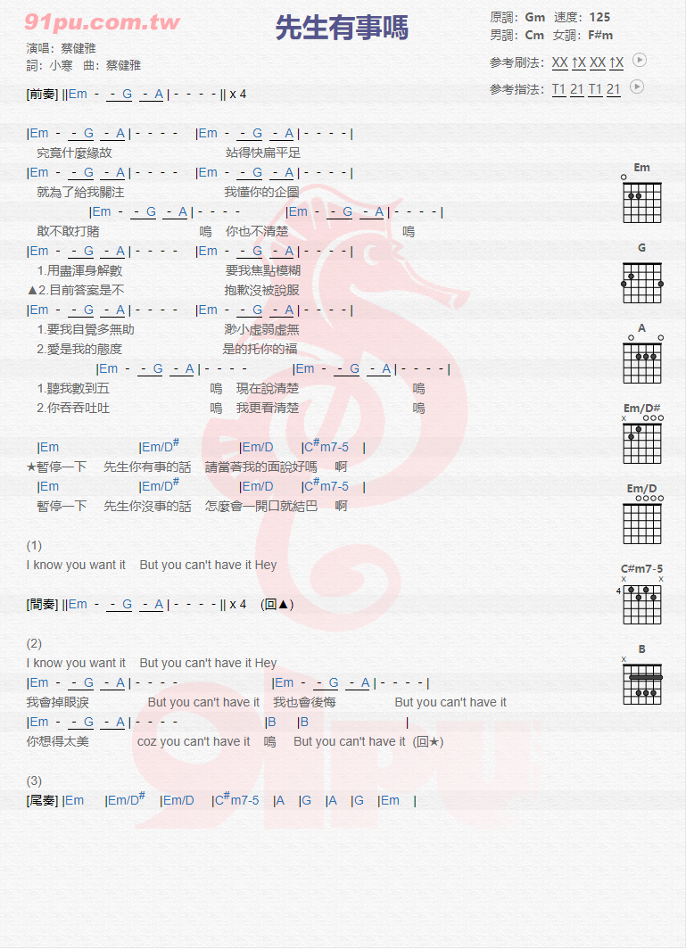 曲谱介绍: 蔡健雅《先生有事吗》吉他弹唱谱,采用G调指法编配,共有1张高清图谱,免翻页排版设计。