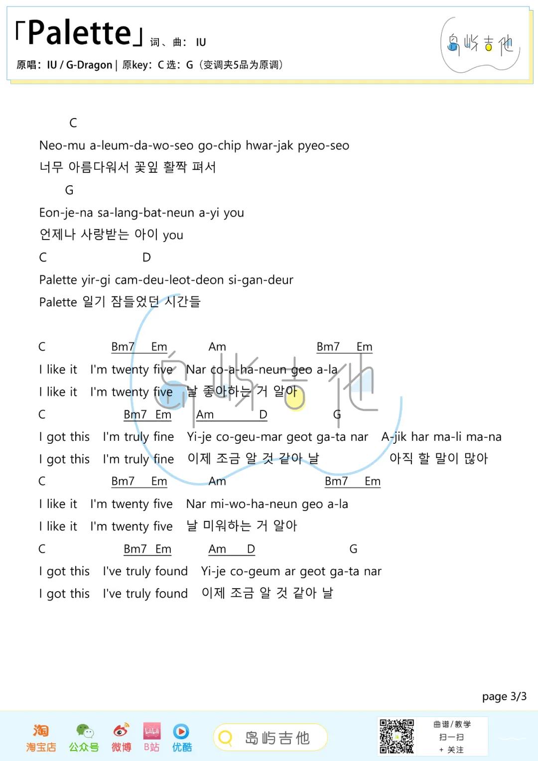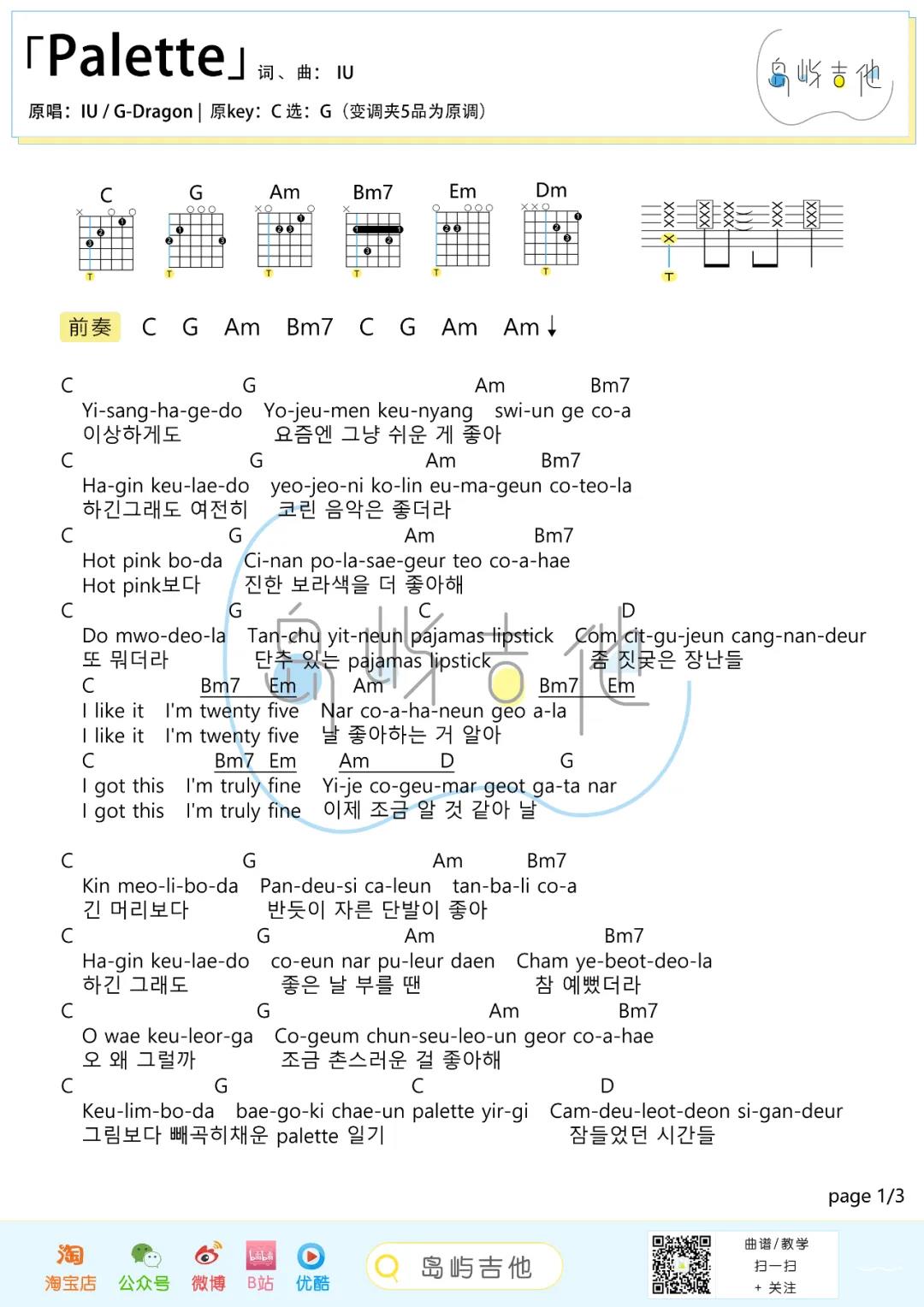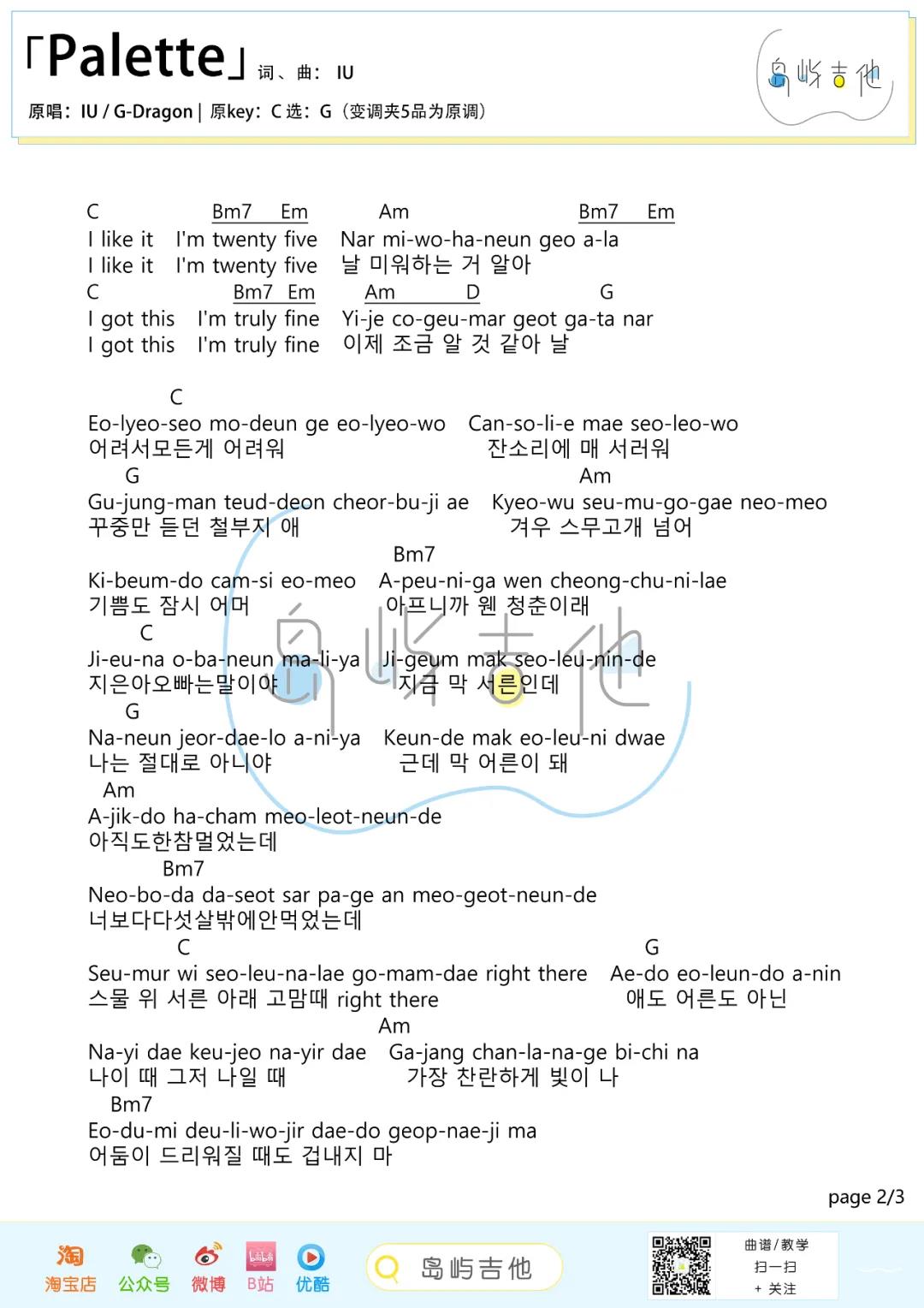 曲谱介绍: IU(李知恩),权志龙《Palette》吉他弹唱谱,采用G调指法编配,共有3张高清图谱。