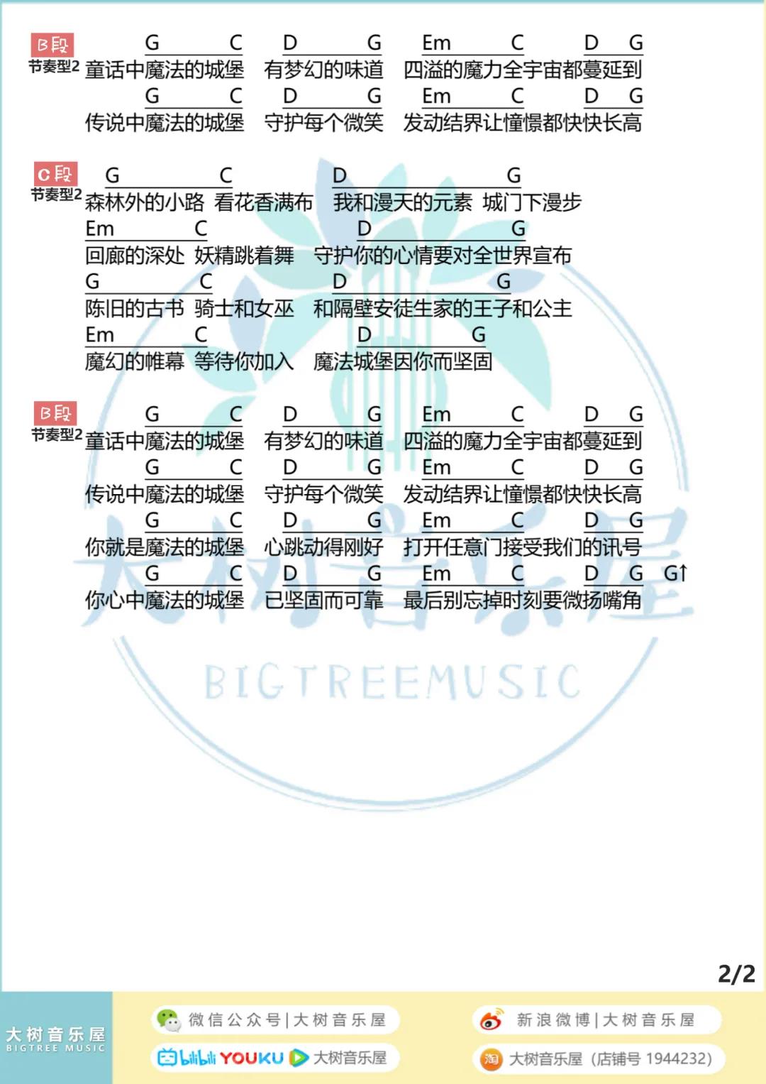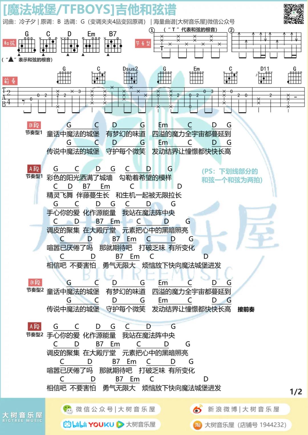 曲谱介绍: TFBOYS《魔法城堡》吉他弹唱谱,采用G调指法编配,共有2张高清图谱,免翻页排版设计。