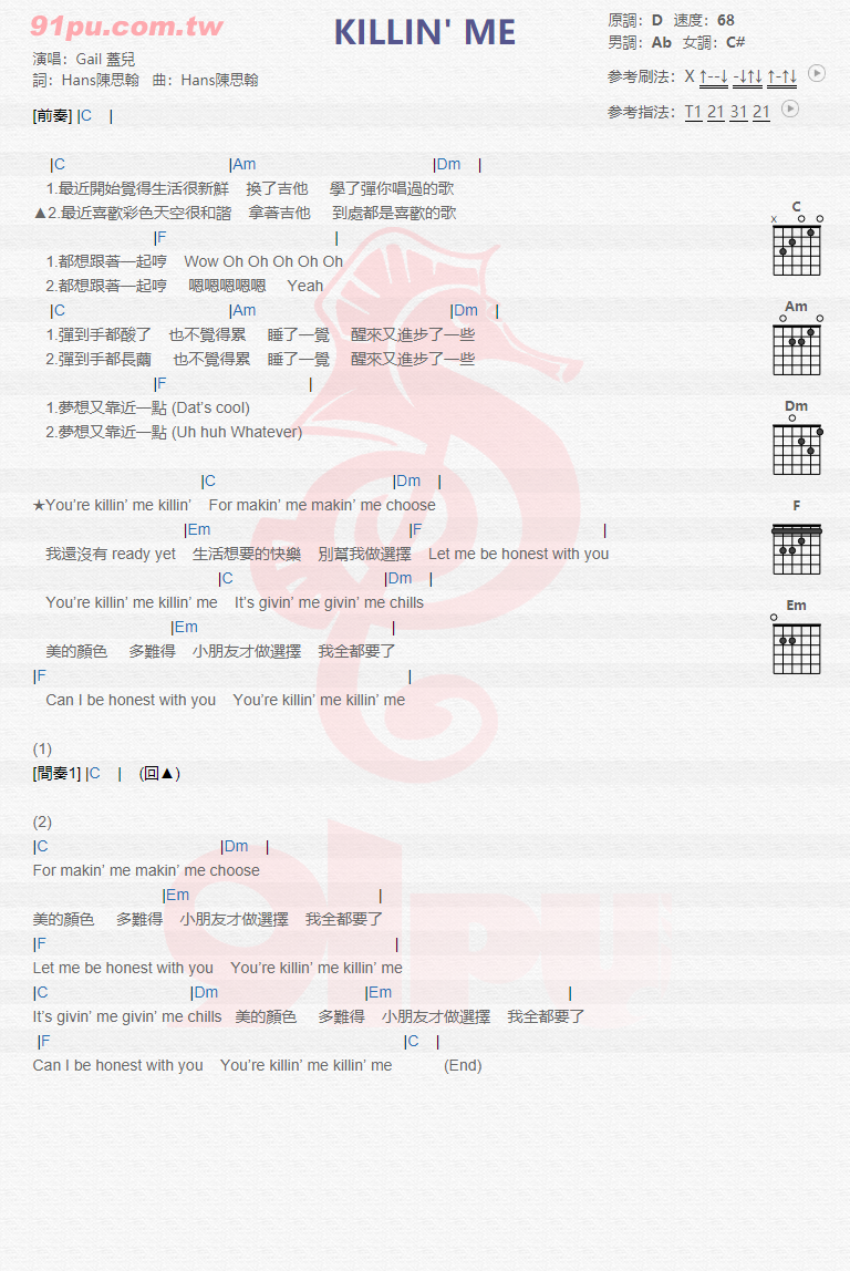 KILLIN ME吉他谱 - Gail盖儿 - D调吉他弹唱谱
