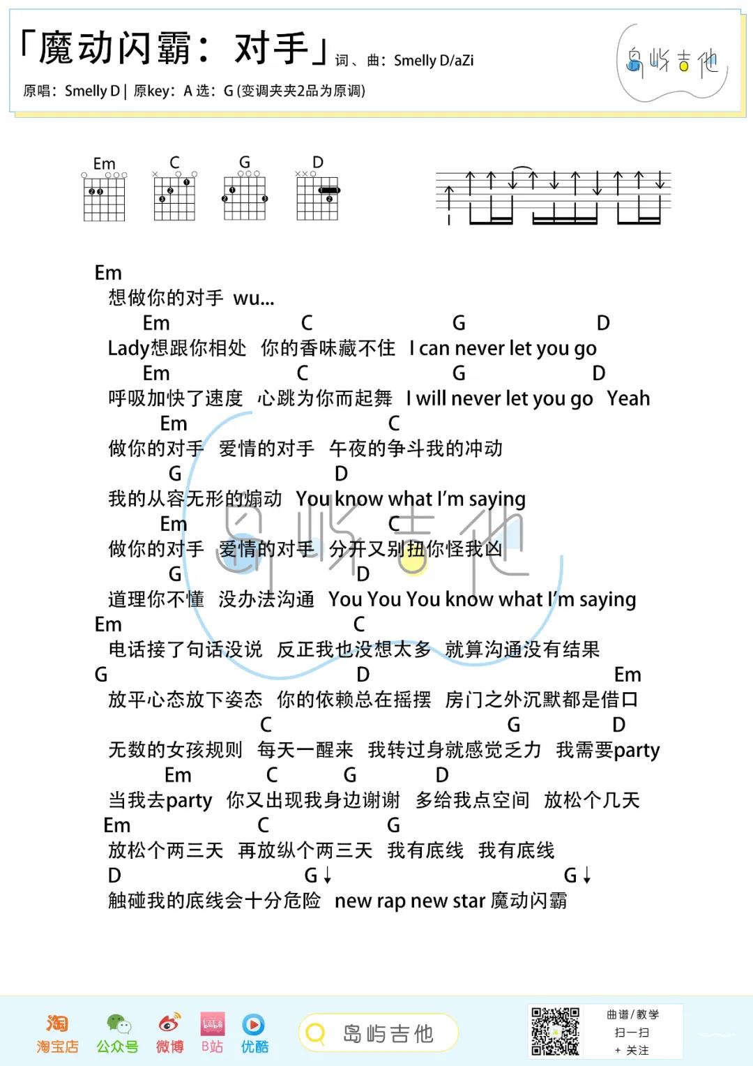 曲谱介绍: Smelly,D《魔动闪霸对手》吉他弹唱谱,采用G调指法编配,共有1张高清图谱,免翻页排版设计。