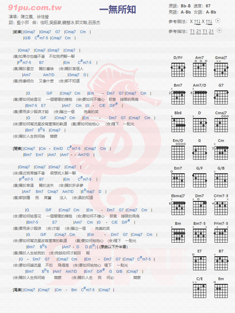曲谱介绍: 陈立农,徐佳莹《一无所知》吉他弹唱谱,采用B调指法编配,共有1张高清图谱,免翻页排版设计。