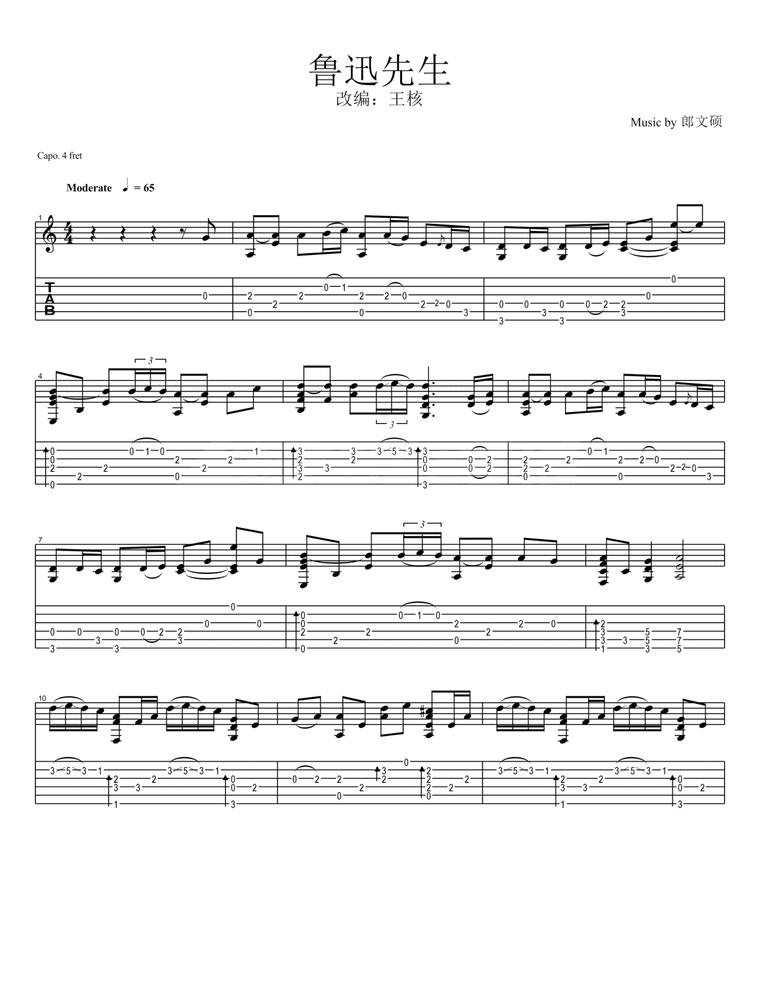 鲁迅先生吉他谱 - 朗文硕 - 吉他独奏谱 - 王核改编