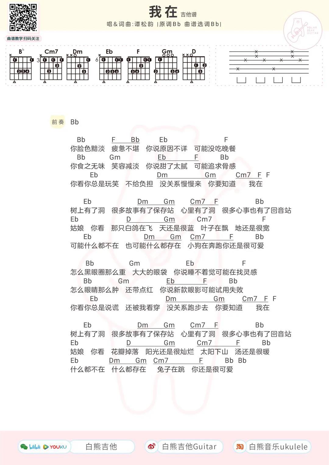 曲谱介绍: 谭松韵《我在》吉他弹唱谱,采用B调指法编配,共有1张高清图谱,免翻页排版设计。