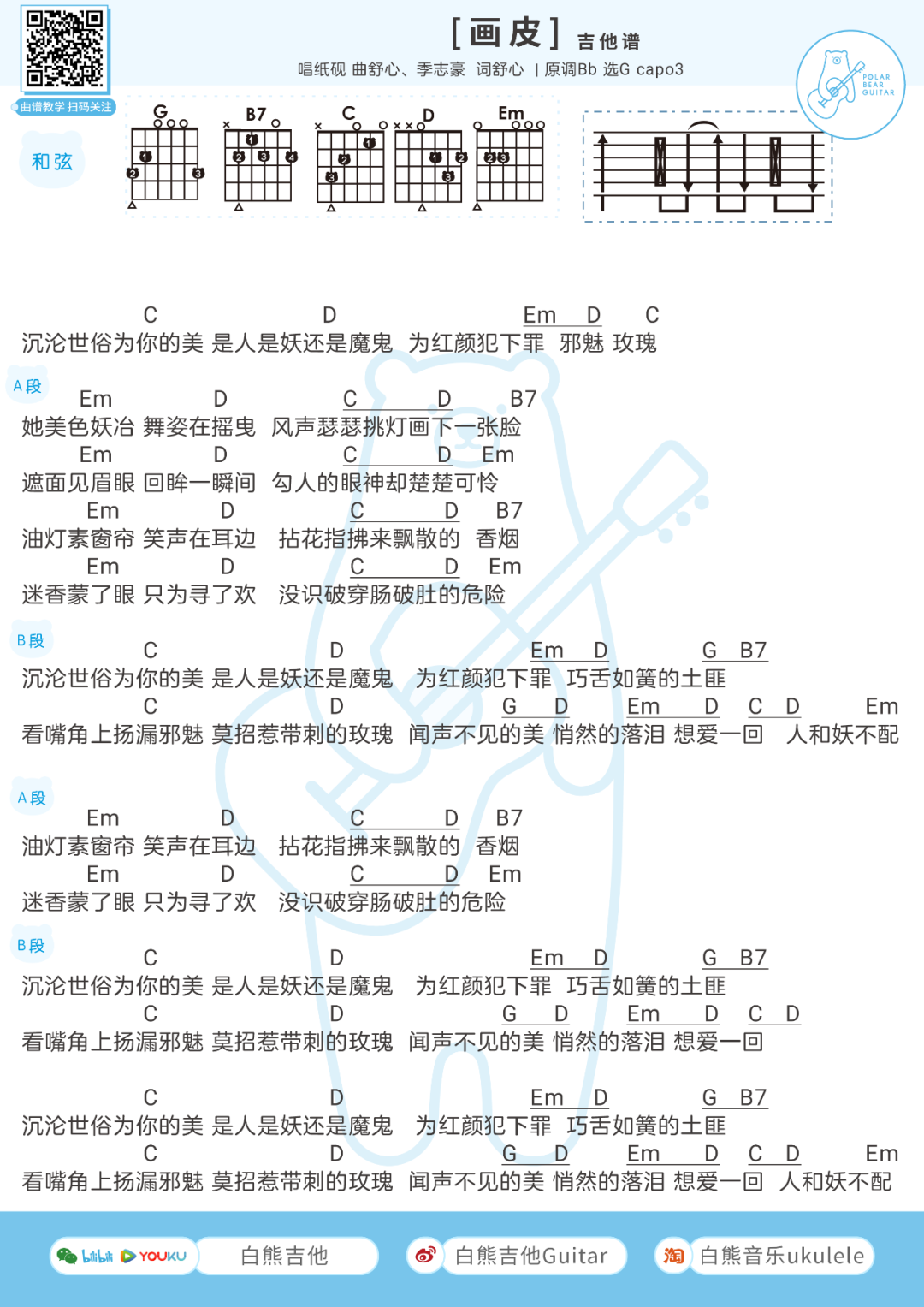 曲谱介绍: 纸砚《画皮》吉他弹唱谱,采用G调指法编配,共有1张高清图谱,免翻页排版设计。