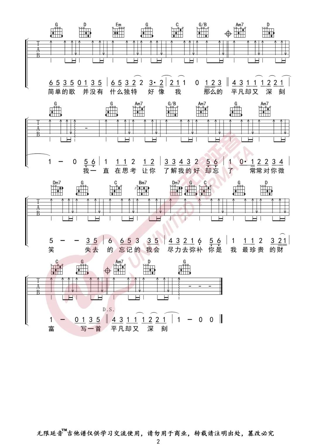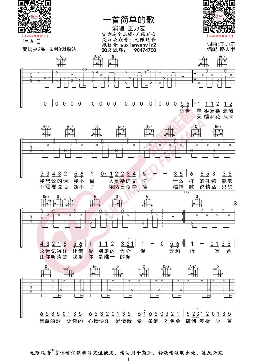 曲谱介绍: 王力宏《一首简单的歌》吉他弹唱谱,采用G调指法编配,共有2张高清图谱,免翻页排版设计。