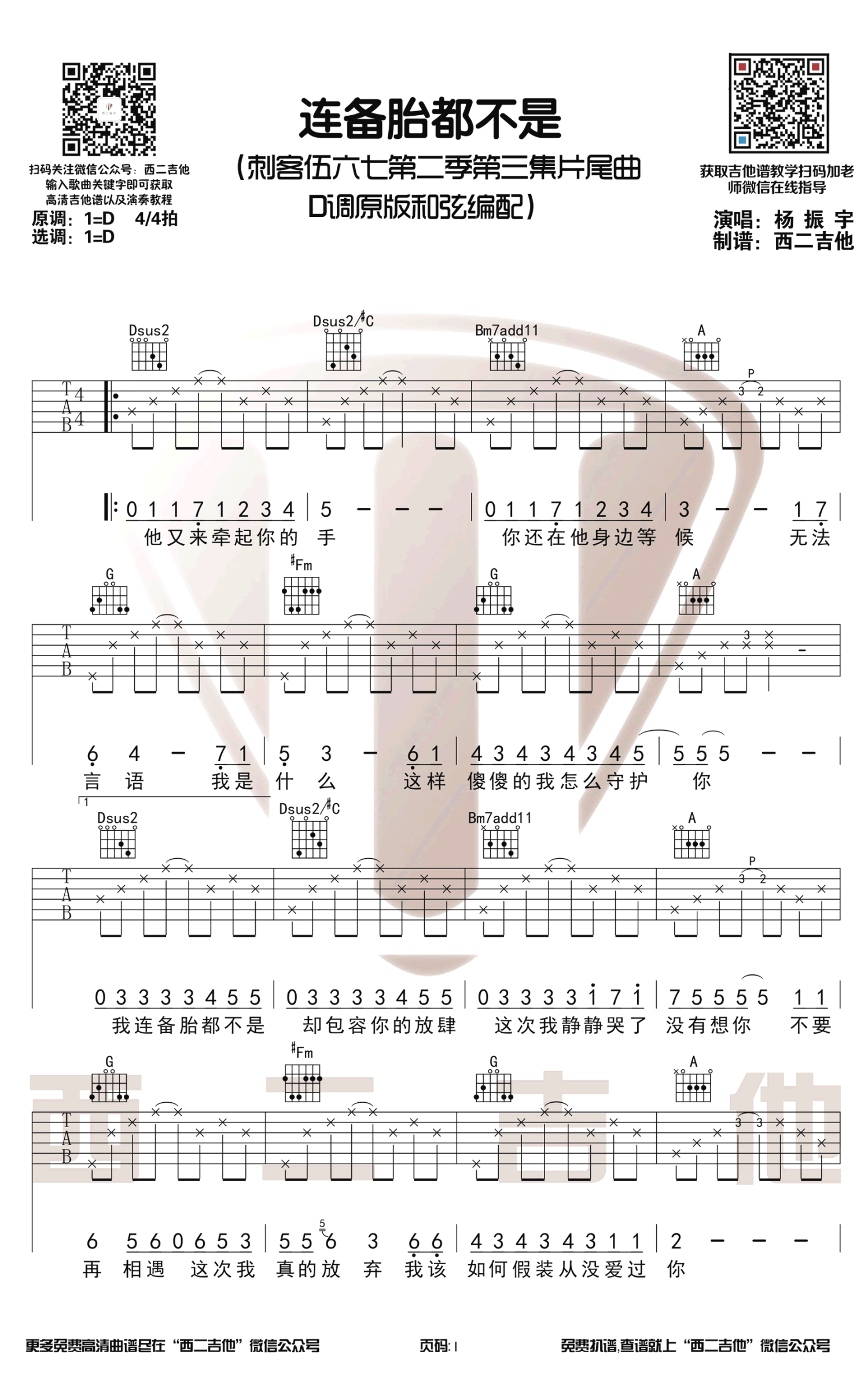 连备胎都不是吉他谱 - 杨政宇 - D调吉他弹唱谱
