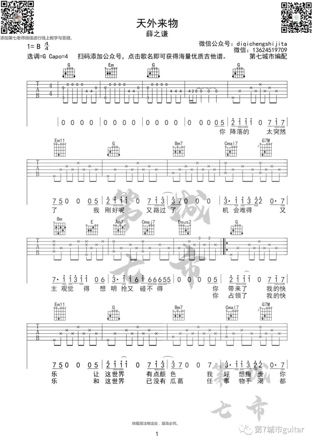 曲谱介绍: 薛之谦《天外来物》吉他弹唱谱,采用G调指法编配,共有3张高清图谱。