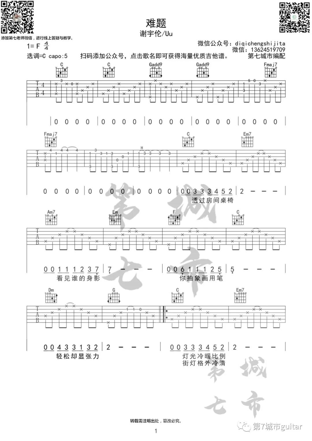 曲谱介绍: 谢宇伦《难题》吉他弹唱谱,采用F调指法编配,共有3张高清图谱。