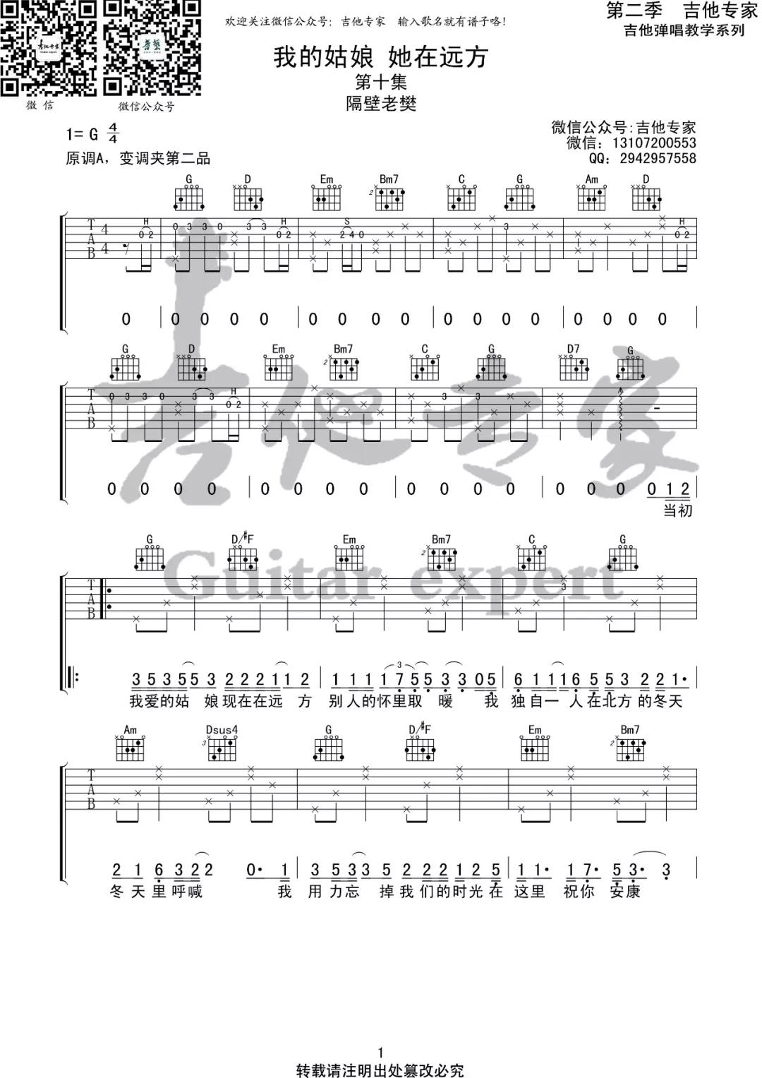 我的姑娘她在远方吉他谱 - 隔壁老樊 - G调吉他弹唱谱