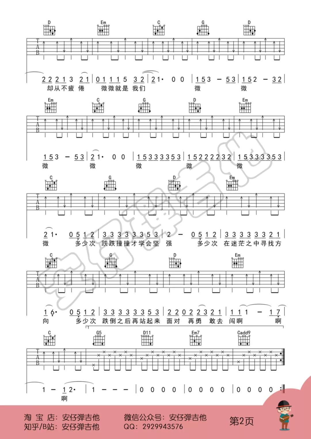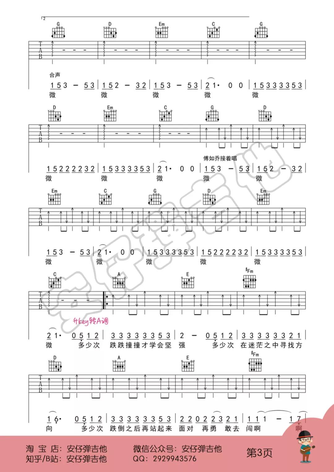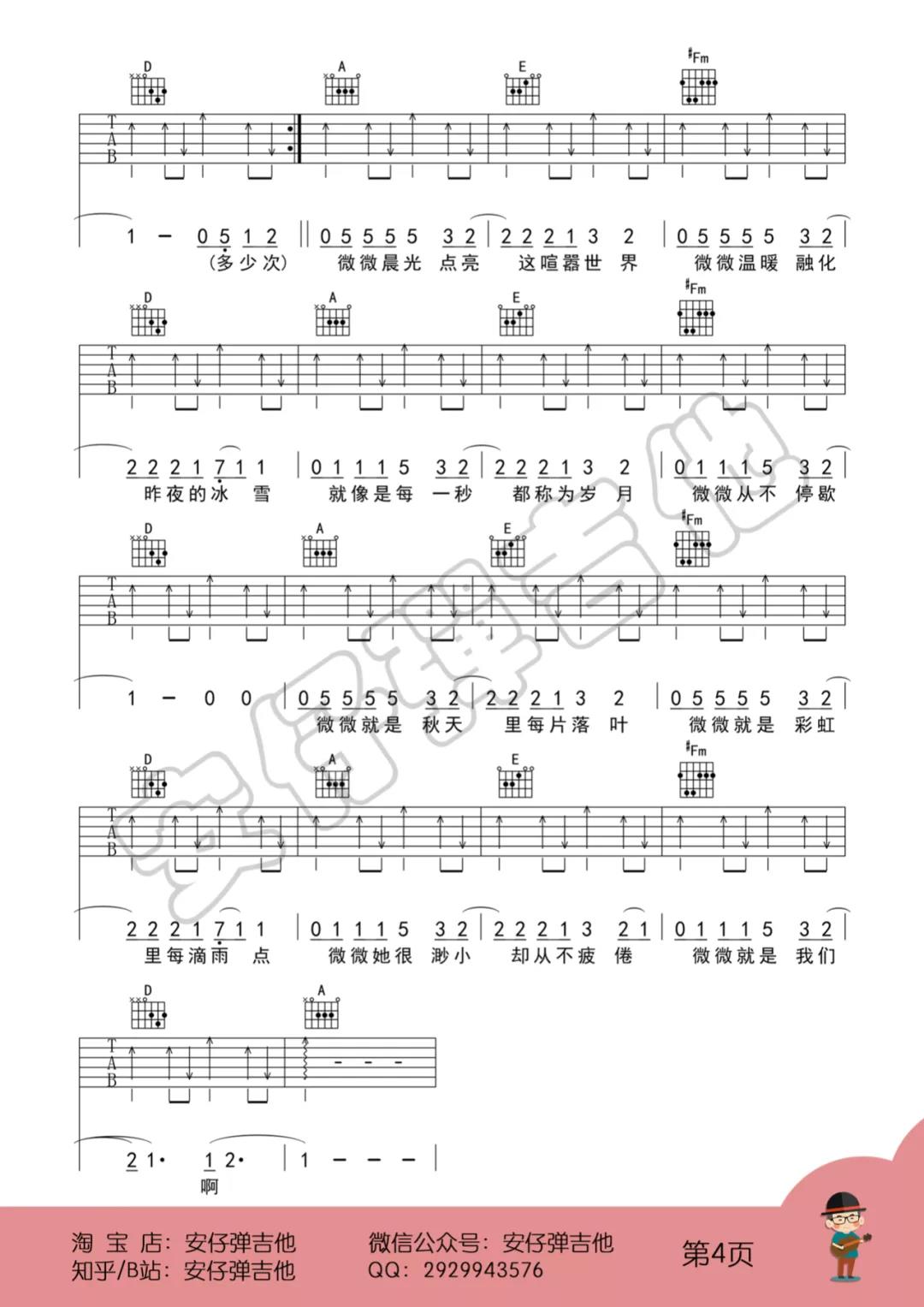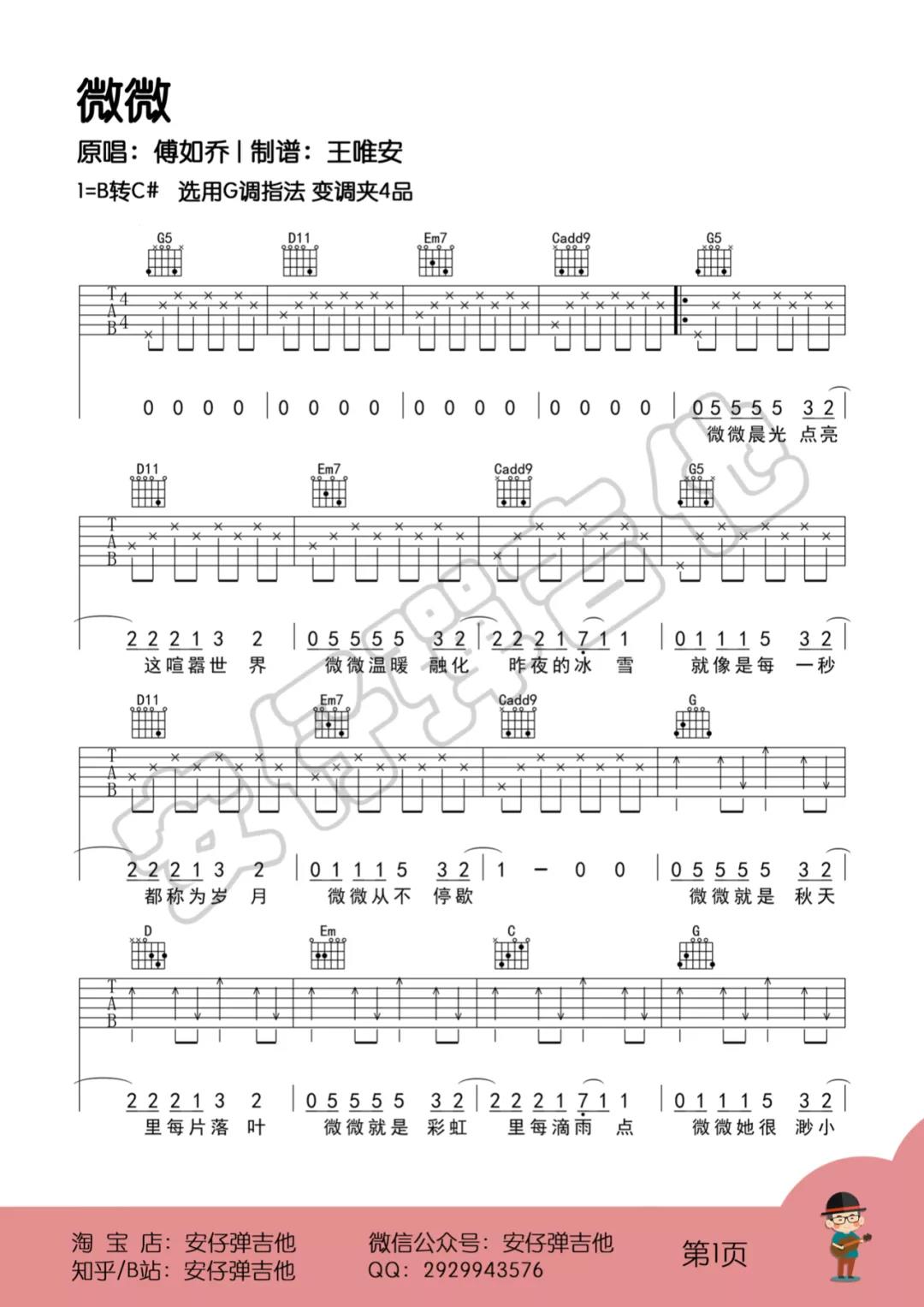 曲谱介绍: 傅如乔《微微》吉他弹唱谱,采用B调指法编配,共有4张高清图谱。