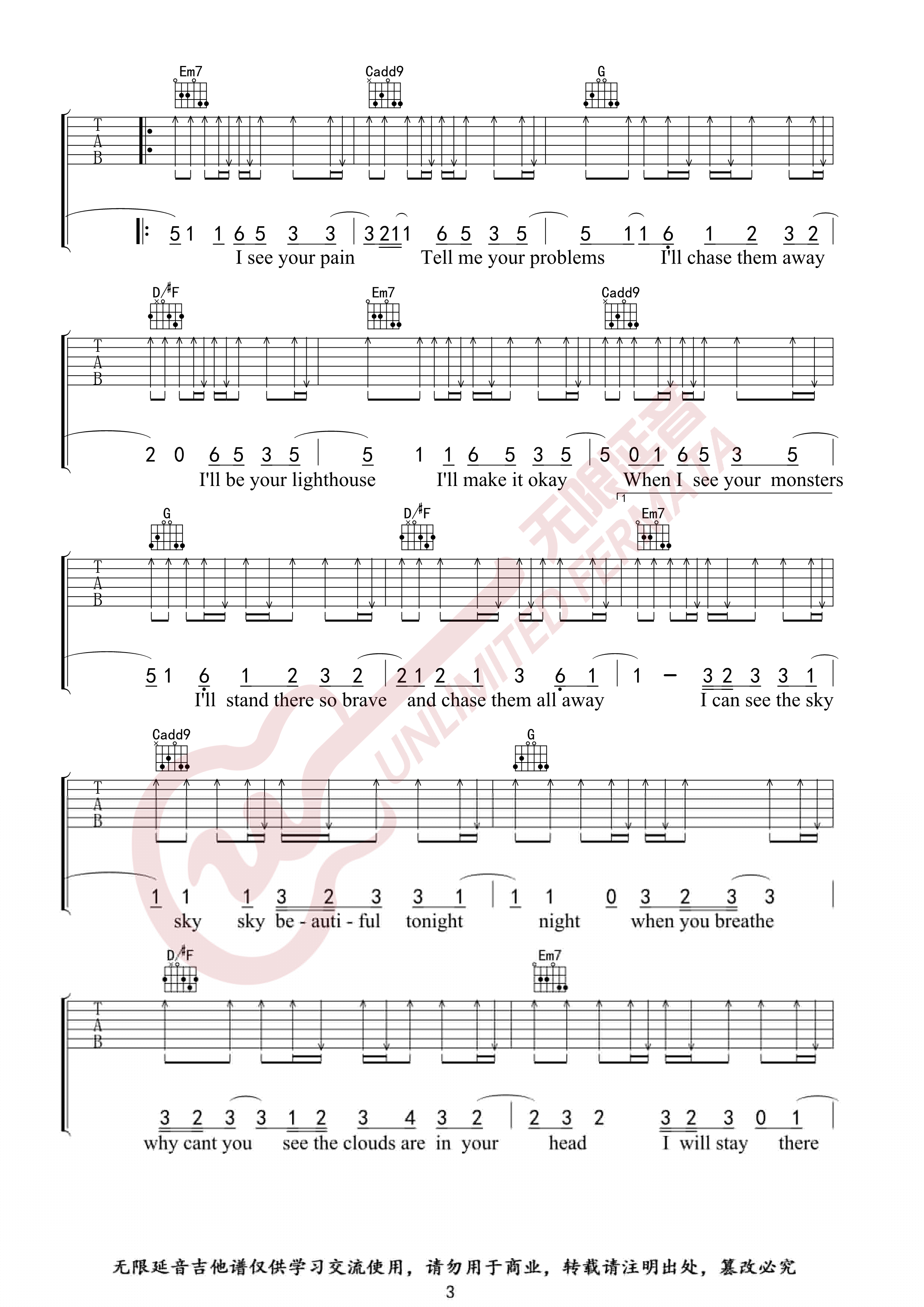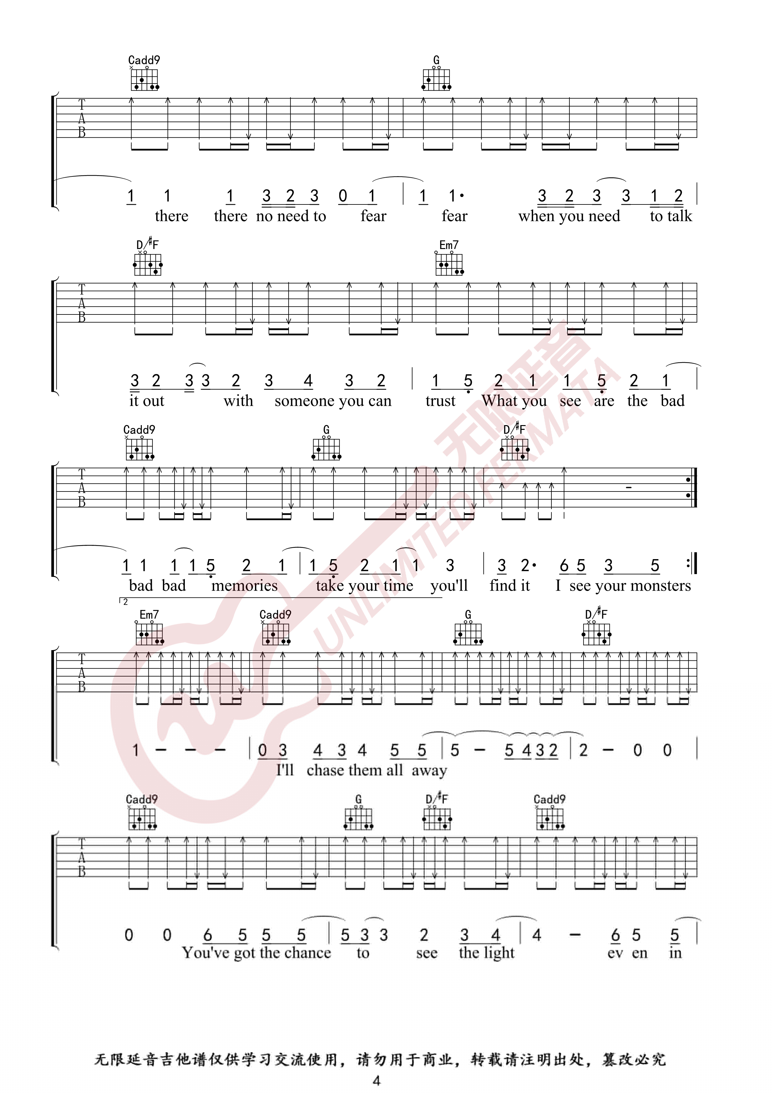 曲谱介绍: Katie,Sky《Monsters》吉他弹唱谱,采用G调指法编配,共有5张高清图谱。