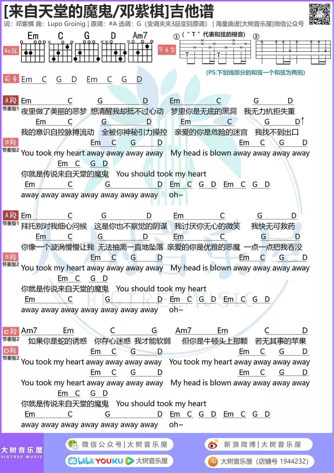 曲谱介绍: 邓紫棋《来自天堂的魔鬼》吉他弹唱谱,采用G调指法编配,共有1张高清图谱,免翻页排版设计。