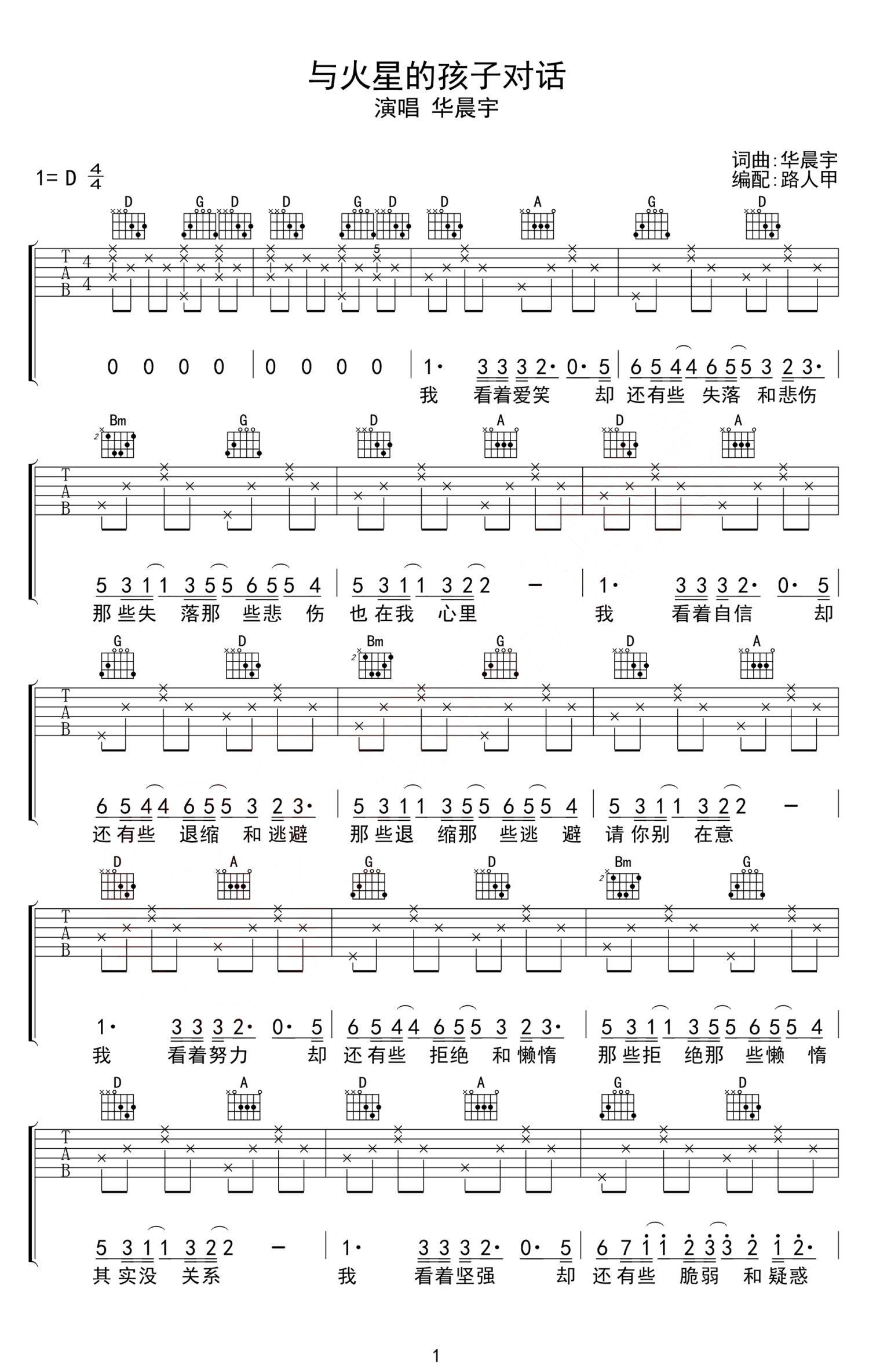 与火星的孩子对话吉他谱 - 华晨宇 - D调吉他弹唱谱