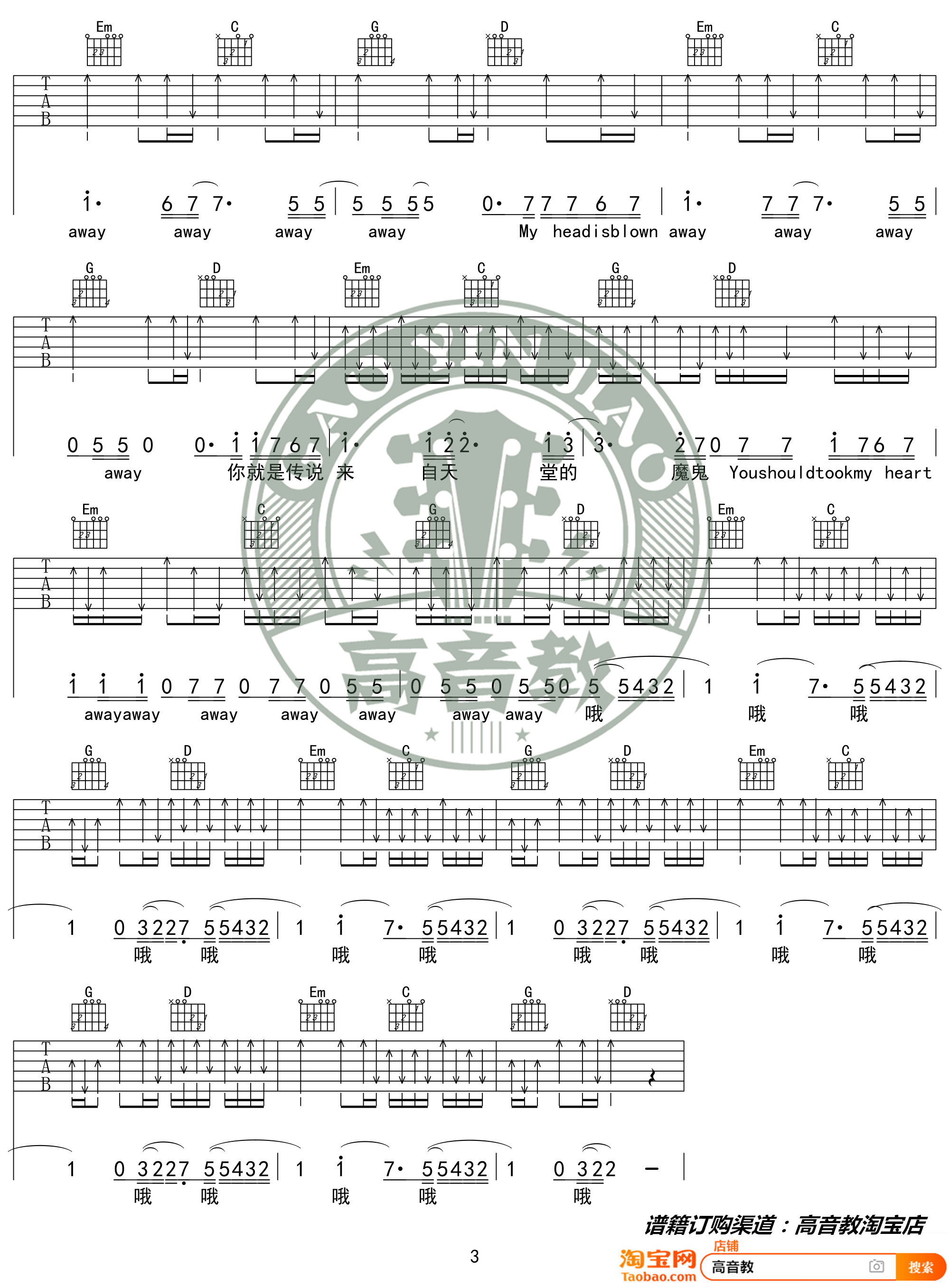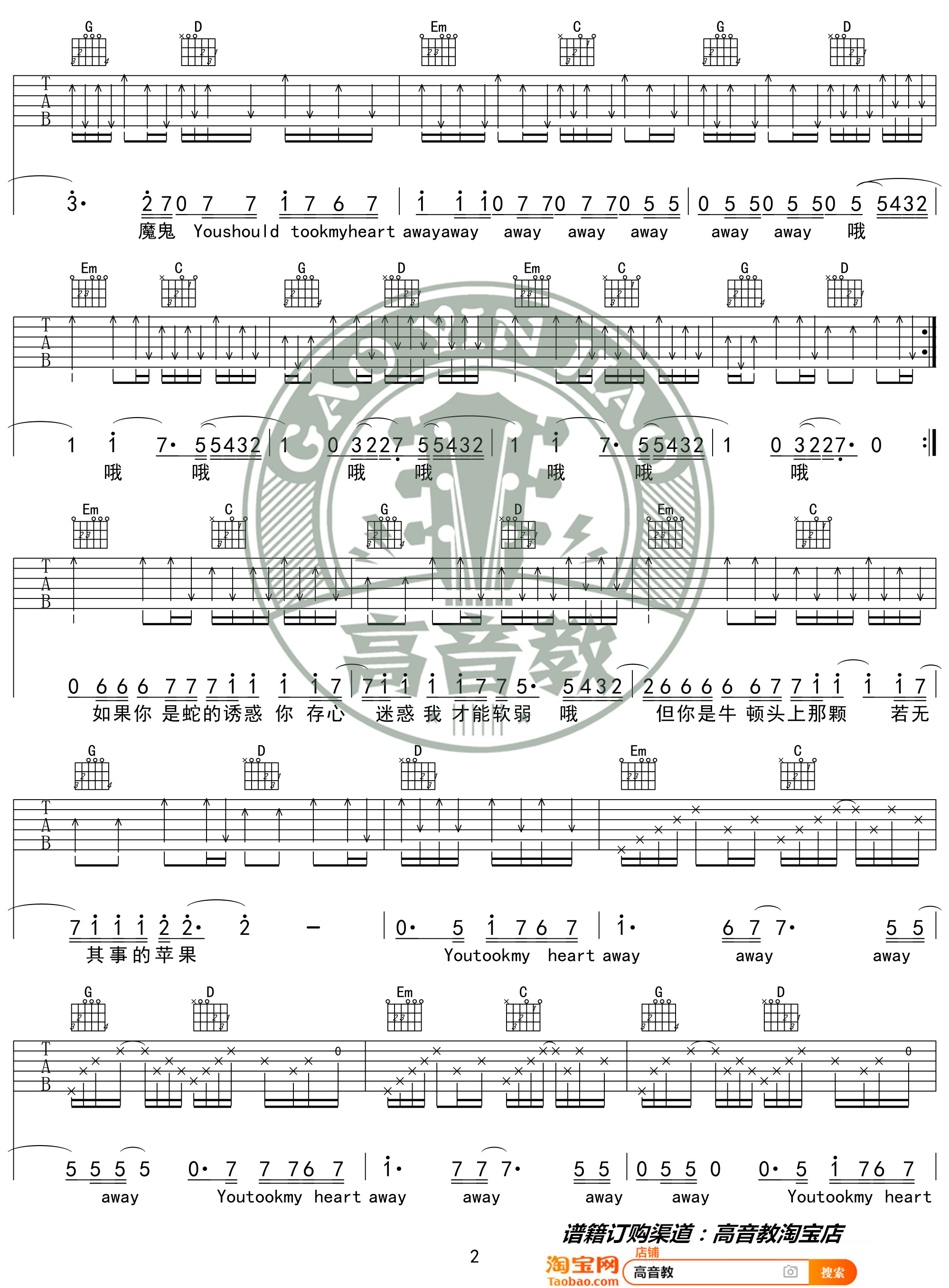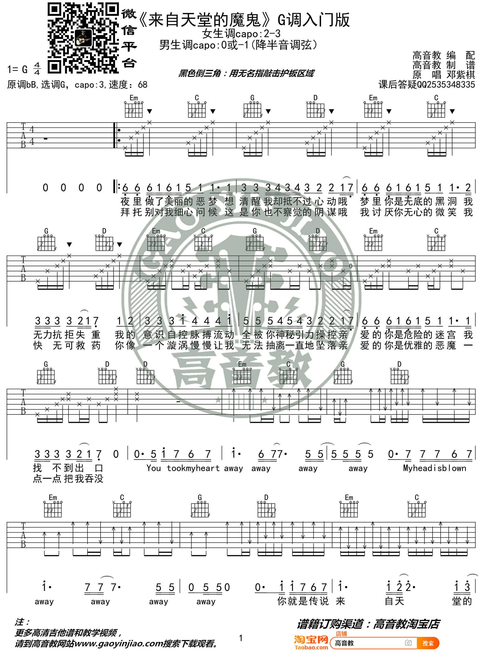 曲谱介绍: 邓紫棋《来自天堂的恶魔》吉他弹唱谱,采用G调指法编配,共有3张高清图谱。