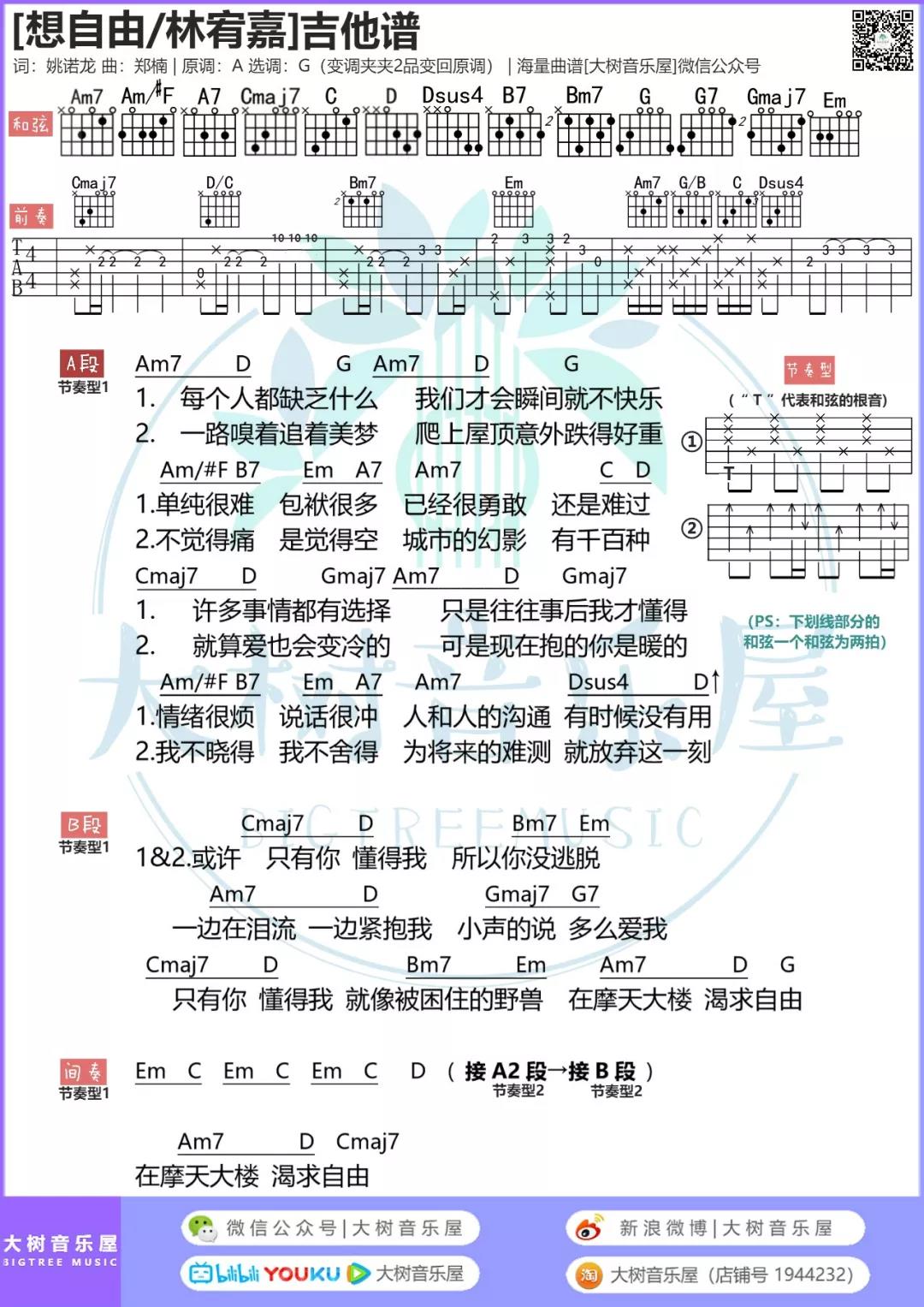 曲谱介绍: 林宥嘉《想自由》吉他弹唱谱,采用G调指法编配,共有1张高清图谱,免翻页排版设计。