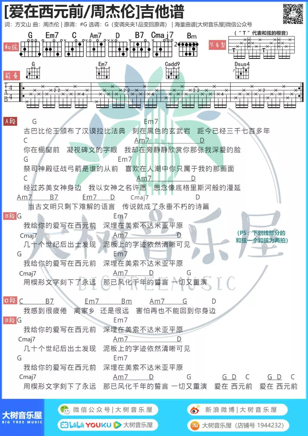 曲谱介绍: 周杰伦《爱在西元前》吉他弹唱谱,采用G调指法编配,共有1张高清图谱,免翻页排版设计。