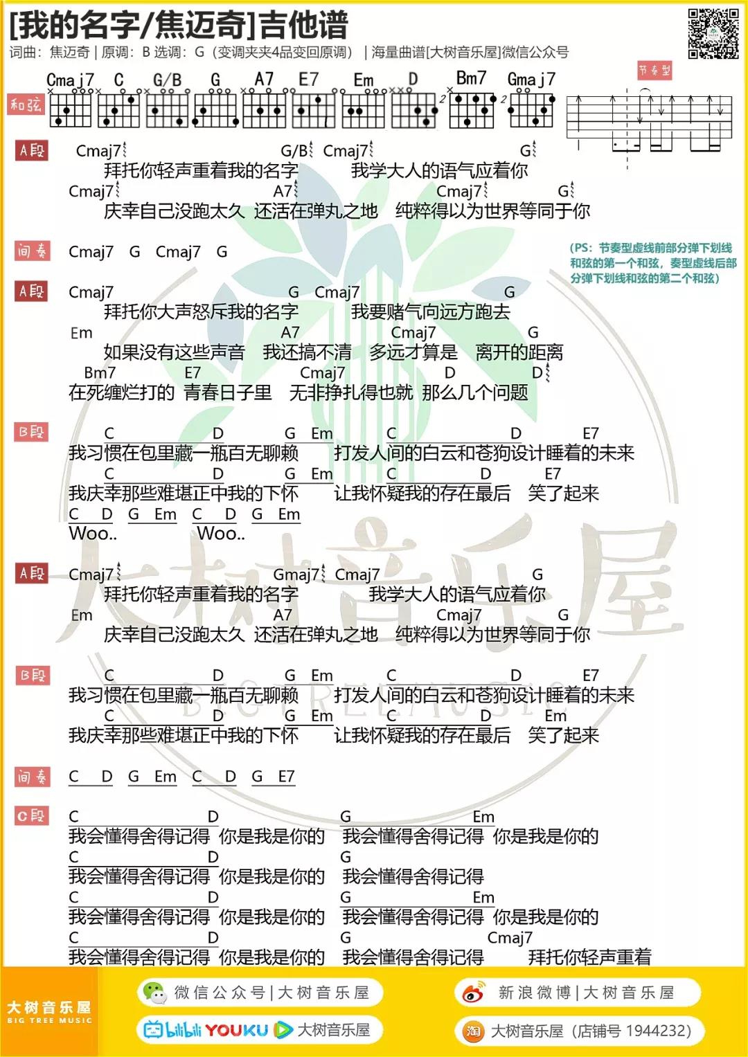 曲谱介绍: 焦迈奇《我的名字》吉他弹唱谱,采用G调指法编配,共有1张高清图谱,免翻页排版设计。